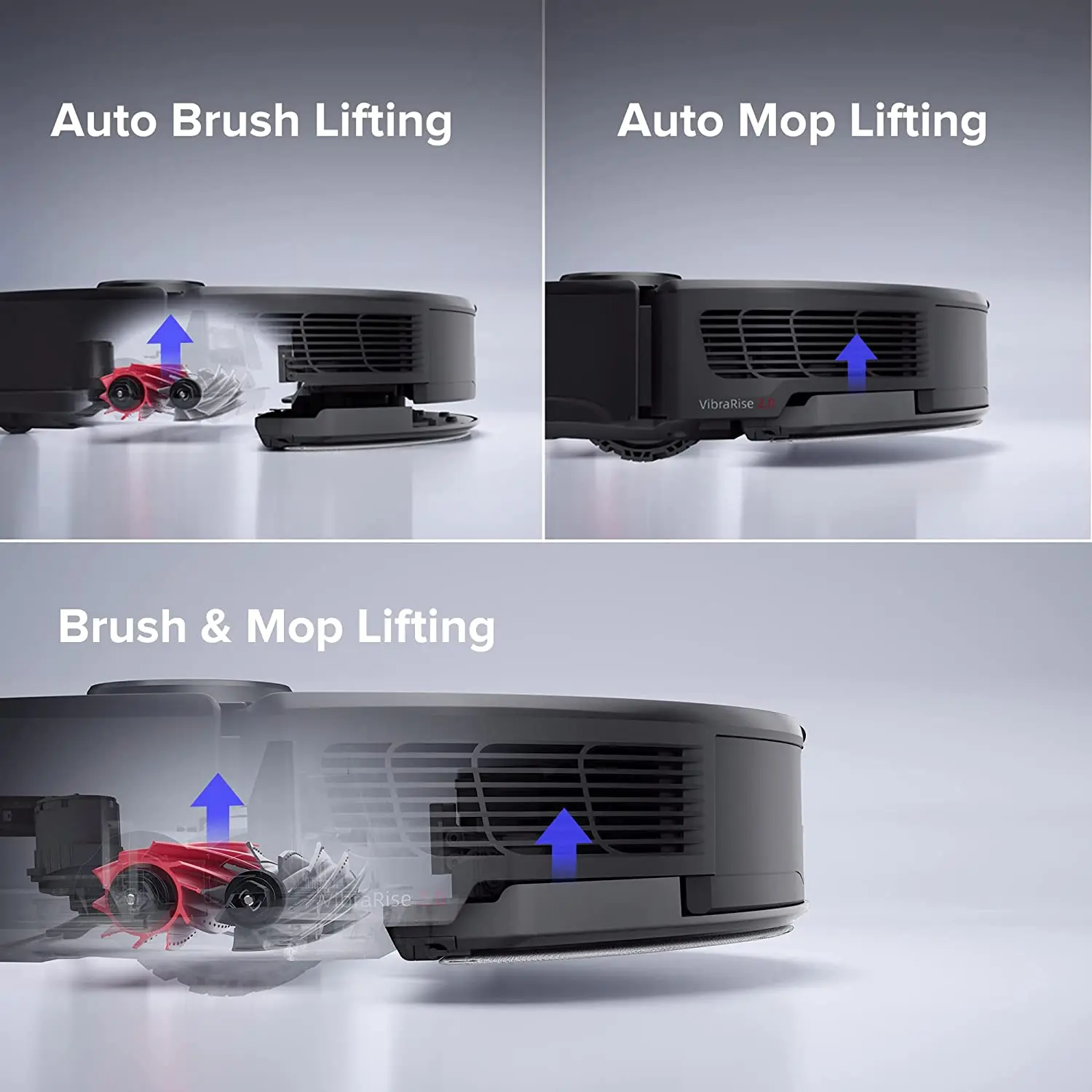 Escovas e esfregões eleváveis oferecem mais.As escovas e o esfregão eleváveis podem separar a aspiração e o esfregão em uma única limpeza, maximiza a eficácia da limpeza para diferentes tarefas, como limpeza de carpetes e limpeza de pisos duros, e evita deixar manchas após uma limpeza.Se um limite de entrada for definido no aplicativo, as escovas e o esfregão se levantarão automaticamente e ajudarão o robô a escalar mais facilmente.