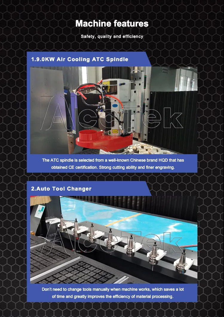 HQD Air-Cooled ATC Spindle: Offers efficient heat dissipation and continuous high-speed cutting, ensuring long-lasting performance and precision for a wide range of materials.