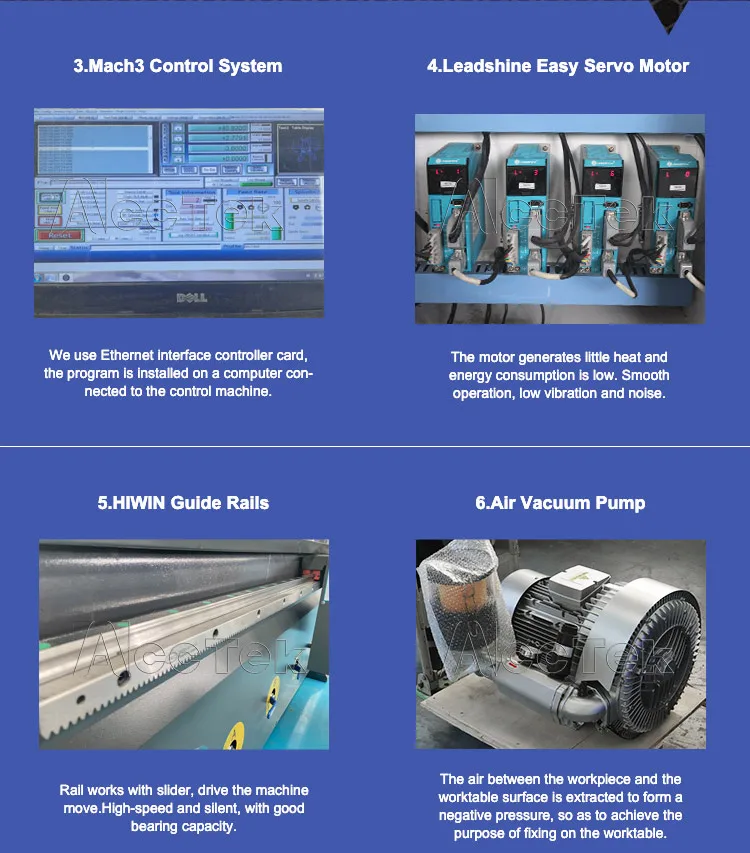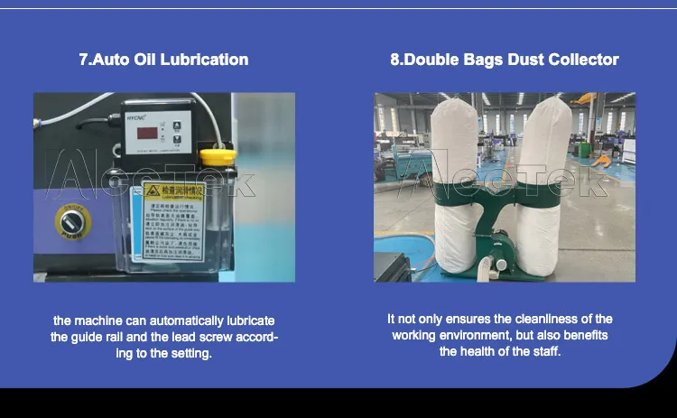 The Taiwan Hiwin guide rails guarantee smooth, stable movement and extended machine life, while the Fuling Inverter ensures a stable power supply for consistent operation during demanding tasks. The vacuum worktable with da double-stage air pump provides strong material hold-down for precision cuts, and the double bag dust collector keeps the workspace clean by efficiently collecting dust and debris.