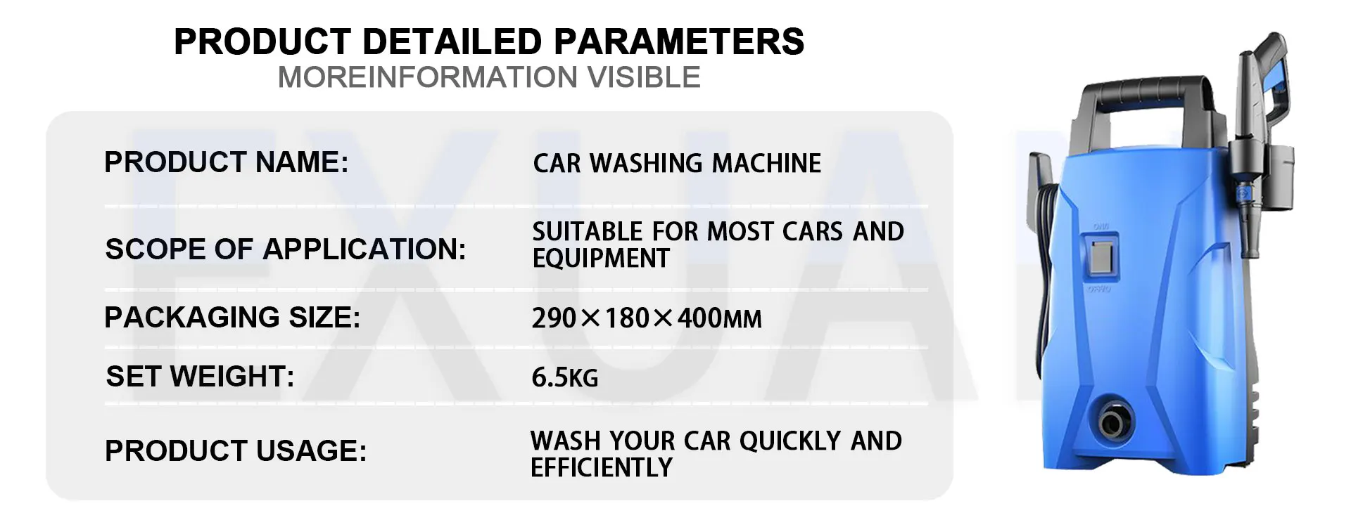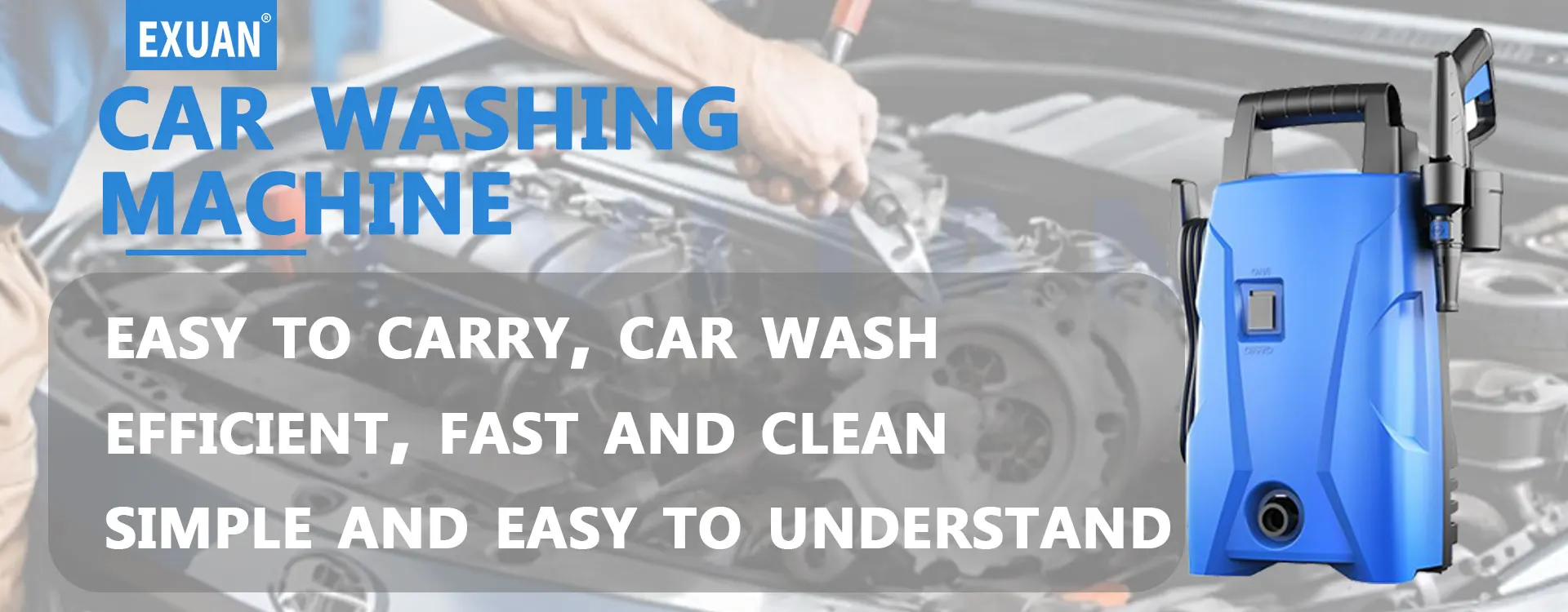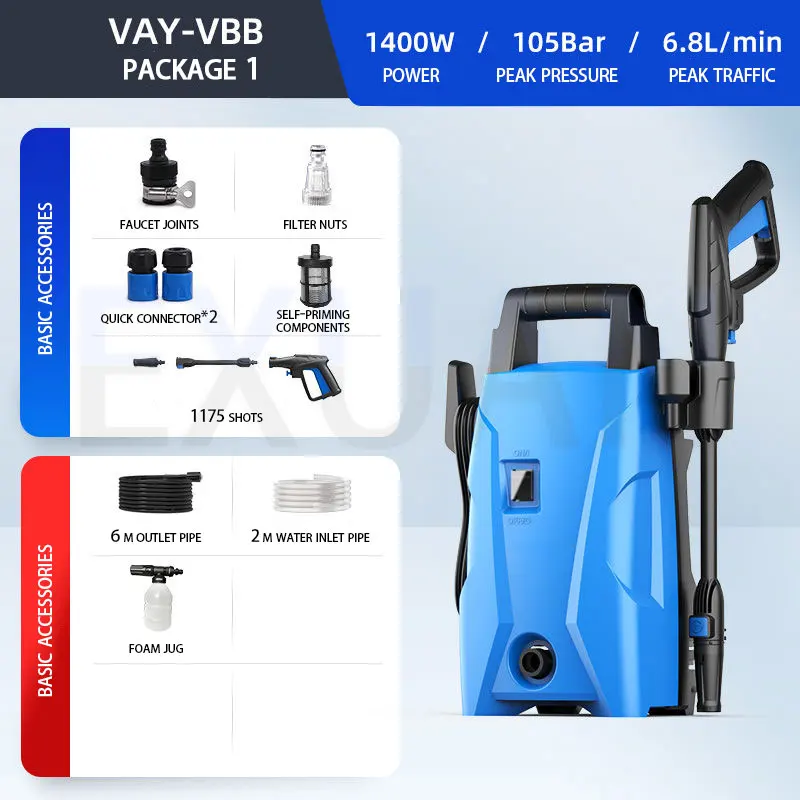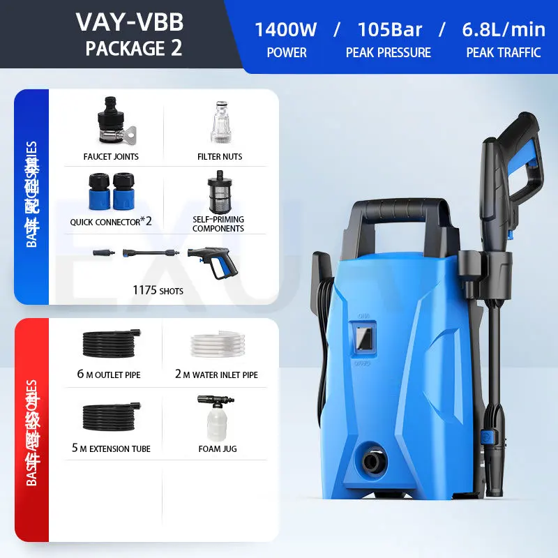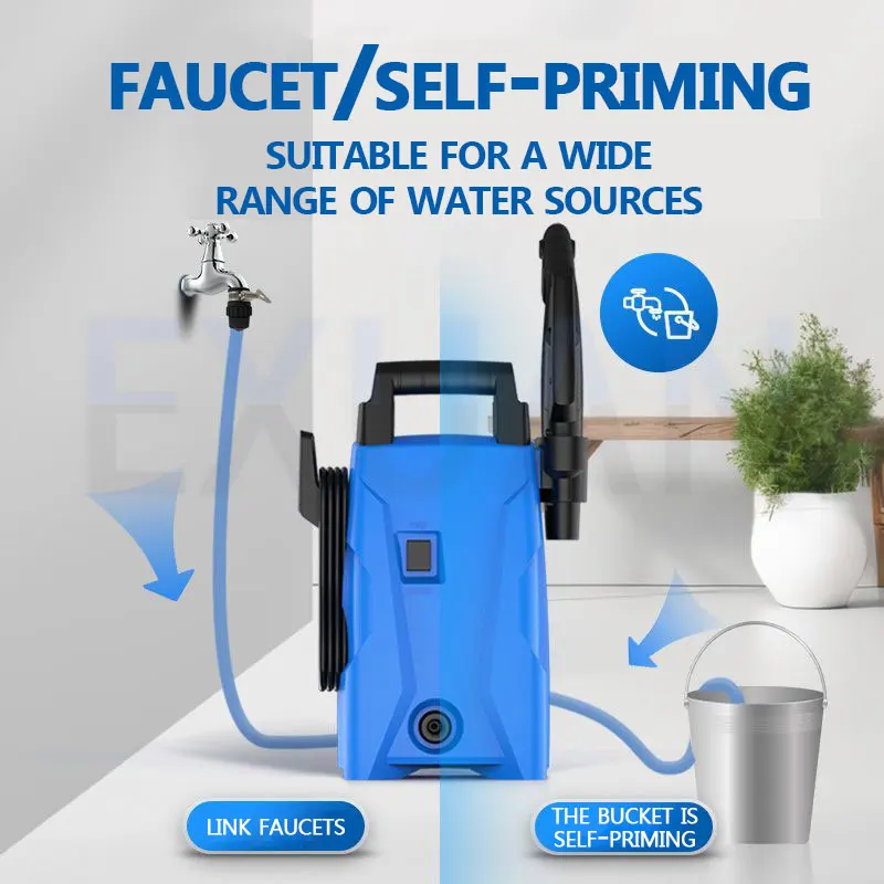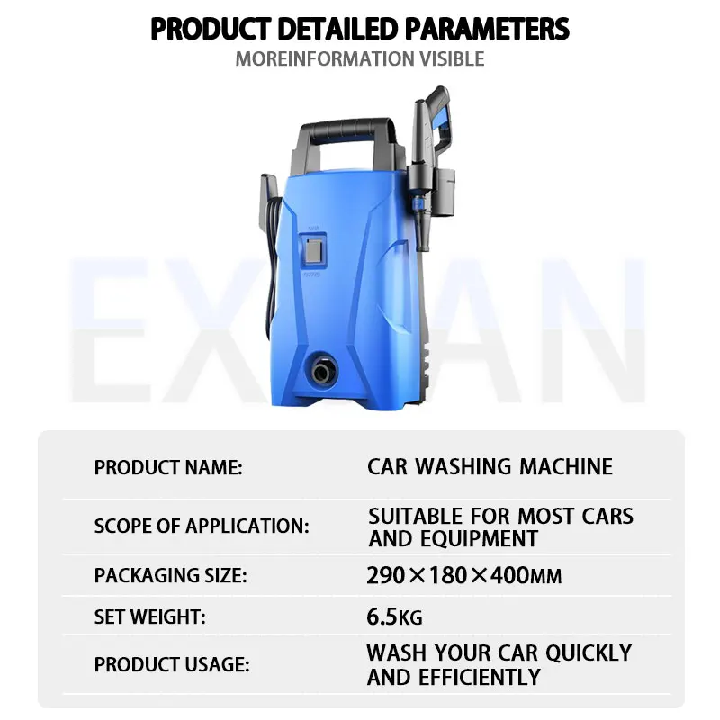 EXUENTEA máquina de lavar carros de alta pressão é um tipo de equipamento de limpeza de alta pressão usado para limpar carros, motocicletas ou outros veículos.Ele pressuriza a água em alta pressão através de bombas de alta pressão, formando uma forte coluna de água, que pode remover de forma rápida e eficiente sujeira, lama, manchas de óleo e outras manchas teimosas na superfície do veículo.Não só pode ser usado para lavagem de carros, mas também para limpeza de pneus, chassis, compartimento do motor e outras peças.