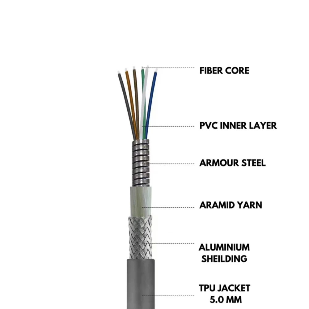 Descrição do produto O cabo de fibra óptica tático blindado monomodo de 4/6/8/12 núcleos foi projetado para ambientes externos difíceis, proporcionando excelente durabilidade e transmissão de dados de alto desempenho.Possui fibra G657A bem buffer para maior flexibilidade e um tubo de armadura em espiral de aço inoxidável para resistir ao impacto mecânico e à pressão externa.Reforçado com fibras de tração de Kevlar, este cabo garante resistência mecânica superior, mantendo propriedades leves e flexíveis.A bainha externa de TPU na cor preta oferece excelente resistência à abrasão, produtos químicos e condições ambientais extremas. Especificações Técnicas- Tipo de fibra: modo único de 4/6/8/12 núcleos, fibra bem buffer G657A