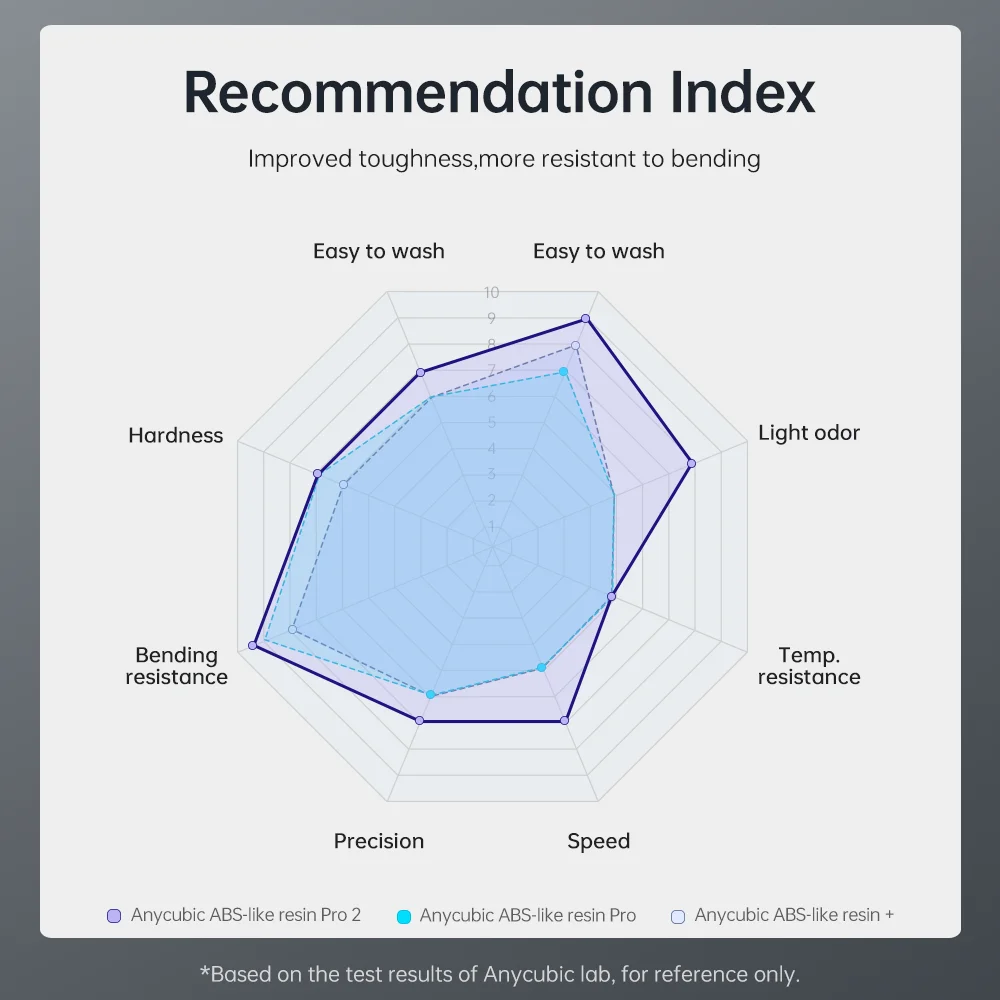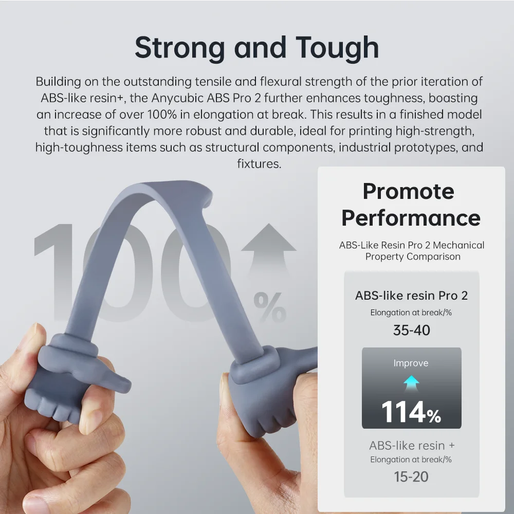Com base na excelente resistência à tração e flexão da versão anterior da resina ABS-like + , Anycubic ABS Pro 2 fortalece o desempenho de tenacidade, aumenta o alongamento na ruptura em mais de 100%, e o modelo acabado é mais forte e mais durável, Que pode ser usado para imprimir modelos de alta resistência e alta tenacidade, como peças estruturais, peças de protótipos industriais e acessórios.