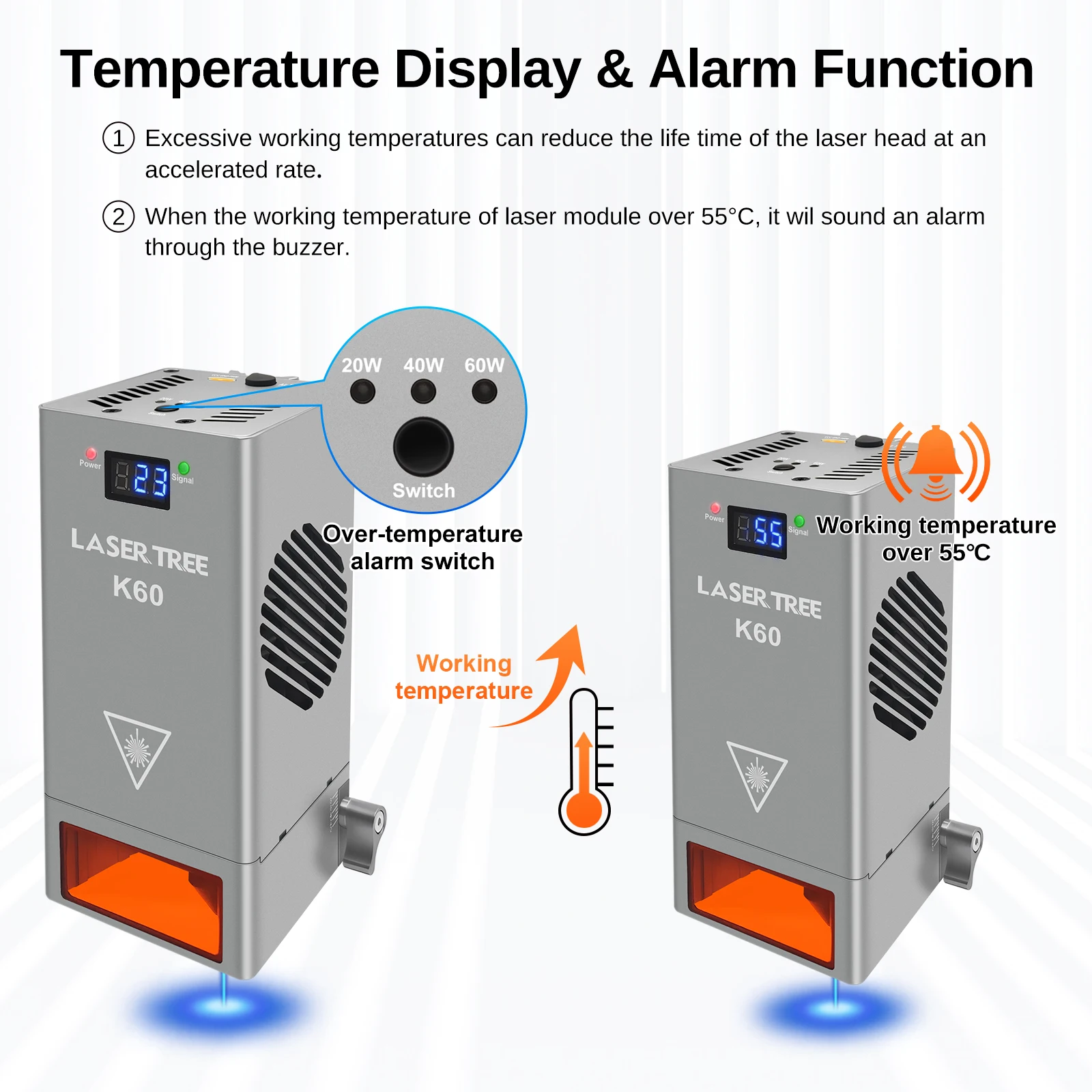 LaserTree K20 cria uma solução com display de temperatura de trabalho, para que você possa verificar facilmente a temperatura interna do módulo.Quando a temperatura de trabalho do módulo laser for superior a 55℃, soará um alarme através da campainha.