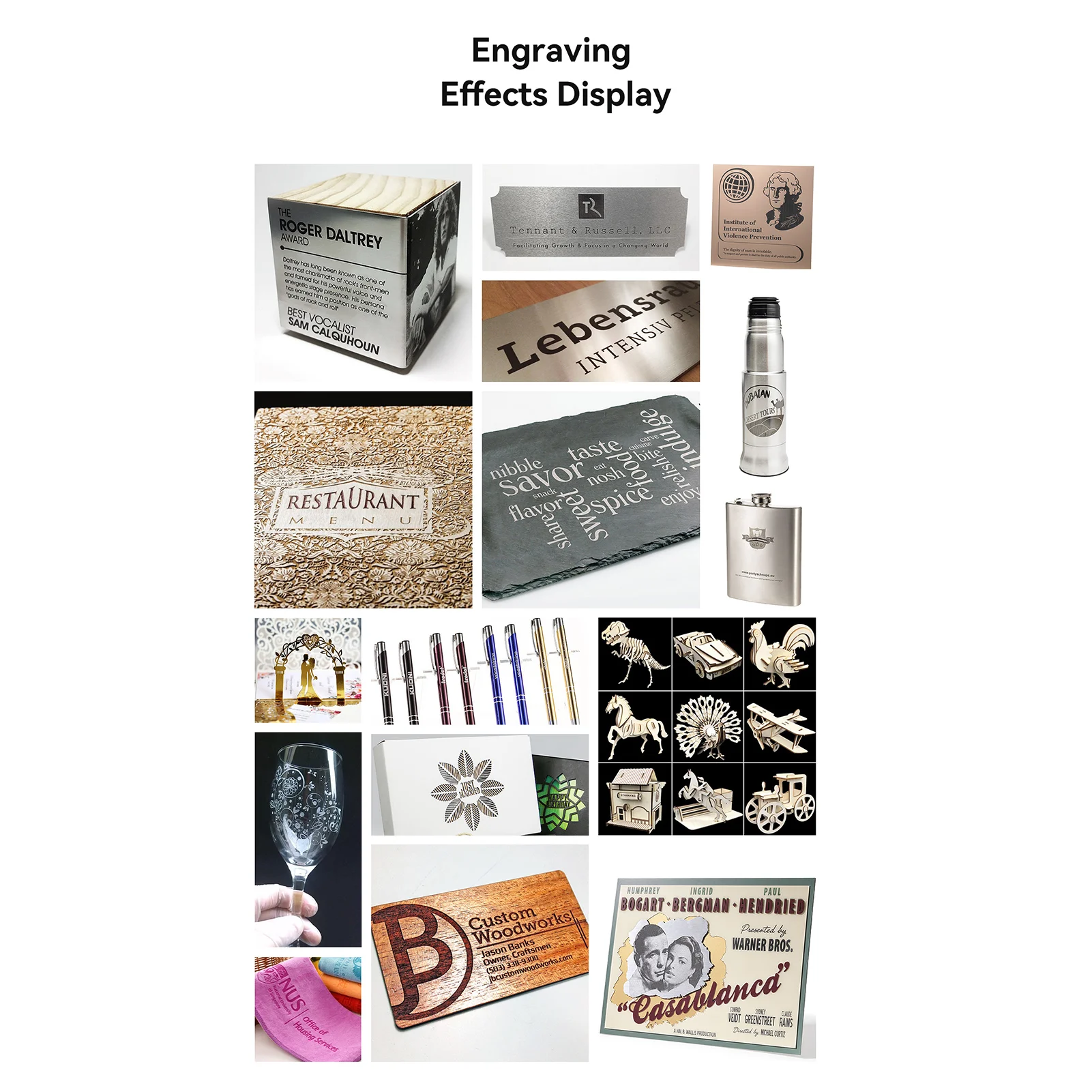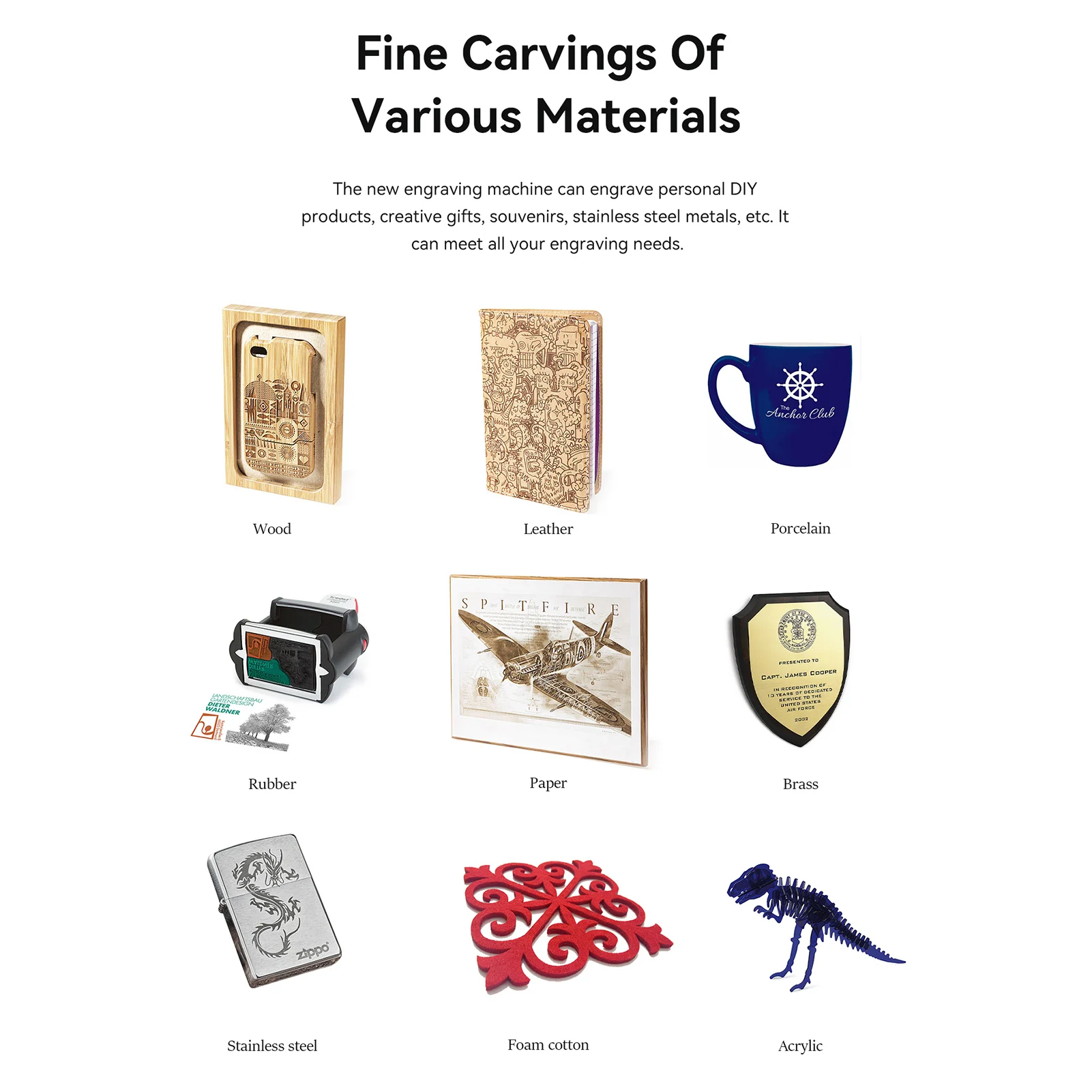 Material de gravura: madeira, bambu, papelão, plástico, couro, placa PCB, alumina, metal chapeado e lacado anti-reflexo, aço inoxidável 304 espelho, vidro, cerâmica, pano de algodão, ardósia;