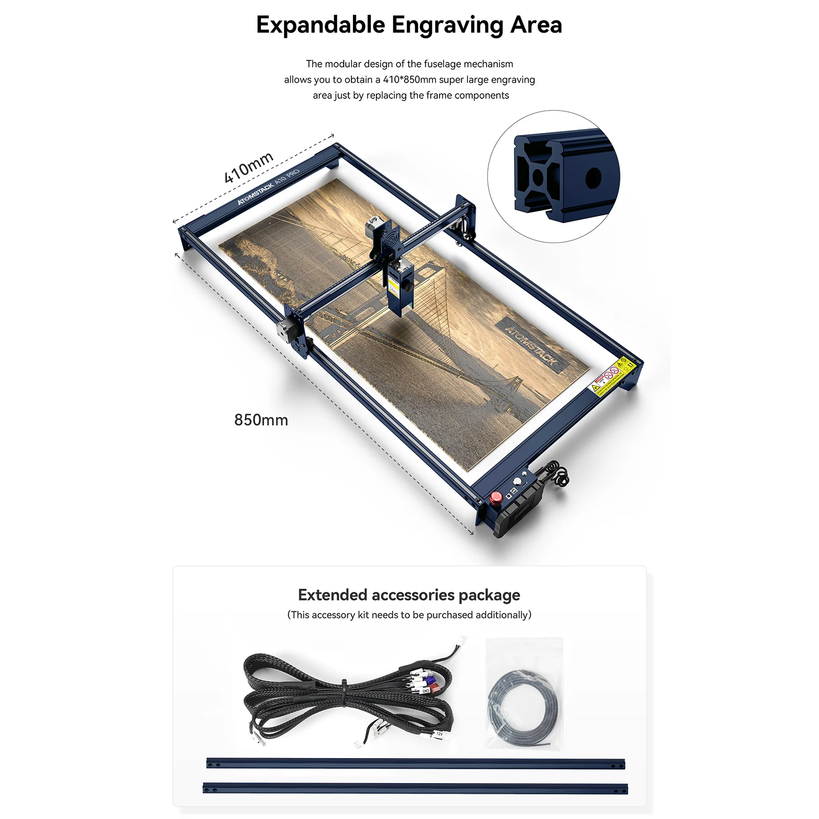 Catorze. Tamanho de gravura expansível: o design modular do mecanismo do corpo, só precisa substituir os componentes do quadro, você pode obter 410*850mm grande tamanho de gravura.