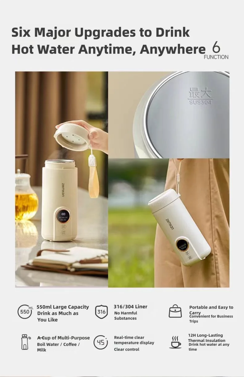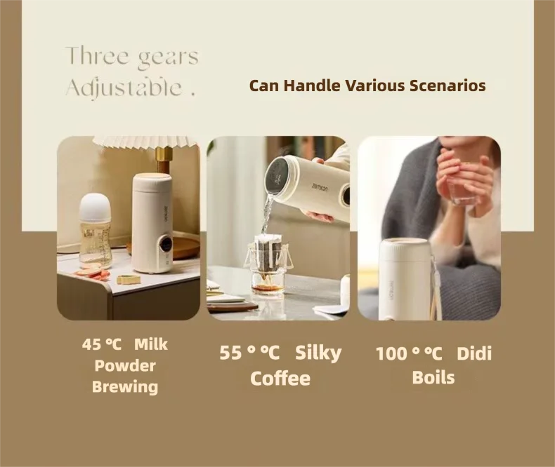 Este copo de água elétrico portátil de 550ML combina praticidade e comodidade, tornando-o um companheiro atencioso para o seu dia a dia e viagem. Possui função de temperatura ajustável, permitindo definir livremente a temperatura da água de acordo com suas necessidades. Seja preparando café, preparando chá ou preparando leite em pó para o seu bebê, você pode encontrar facilmente a temperatura adequada. A tecnologia de temperatura constante pode manter a temperatura da água na temperatura definida por um longo tempo, permitindo que você beba bebidas quentes a qualquer momento. O design à prova de vazamentos é um destaque importante, com tampa selada e estrutura anti-transbordamento. Mesmo que seja agitado ou invertido na bolsa, não há necessidade de se preocupar com vazamento de líquido, resolvendo completamente suas preocupações. Quer se trate de trabalho de escritório, viagens ou atividades ao ar livre, pode lhe proporcionar calor e comodidade.