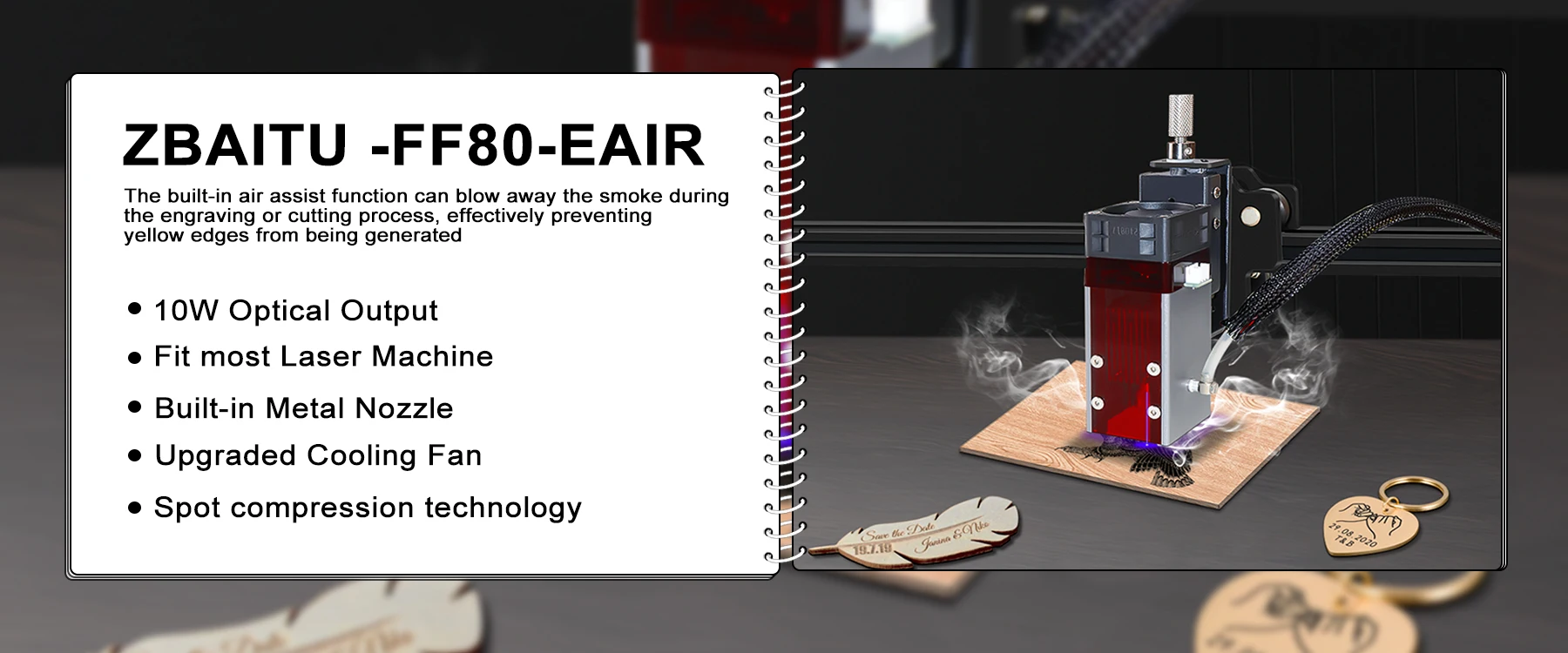 The air assist set is a necessary part for laser cutting and engraving machines. It is suitable for ZBAITU FF80-EAIR (10W). It provides a steady and high-pressure flow of air to blow away the smoke, which is very hot and may make the workpiece turn yellow. Help you get better work. In addition, it can improve the efficiency of laser processing and thus save your time. Features High-quality materials: metal nozzle, resisting high temperature. Large and steady air output: 30 L/min, blowing away smoke and residue produced during laser processing Super silent: little noise and vibration in operation. Small in size: can be placed on desktop. Easy installation: can be easily transformed and upgraded Specifications Power supply voltage: 200-240V AC-50Hz Air output: 30 L/min Rated power: 16W Size:130x130x78mm