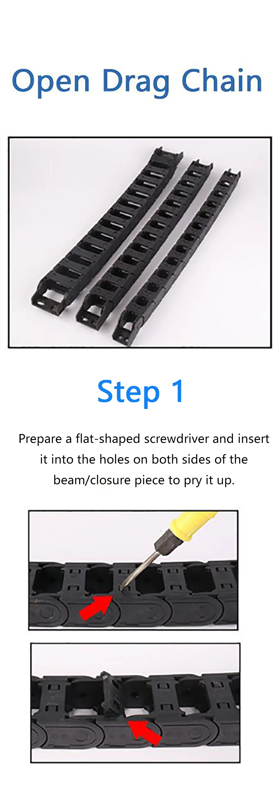 Para obter instruções de instalação, desmontagem e uso da corrente de arrasto, você pode consultar a figura abaixo para instalá-la ou substituí-la.