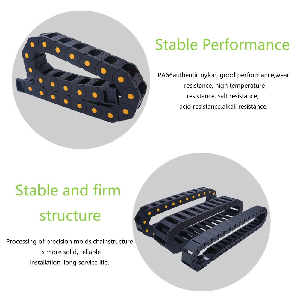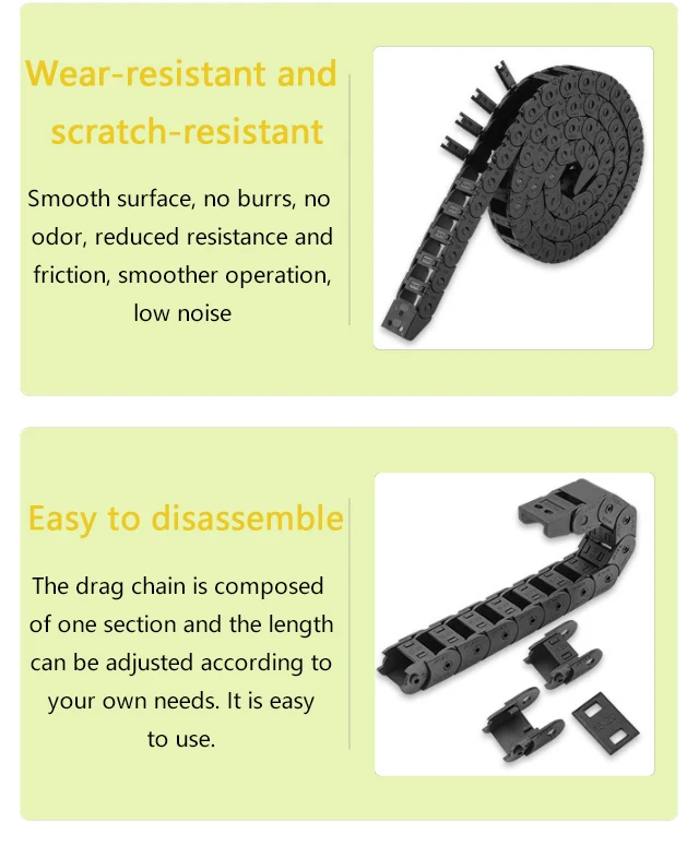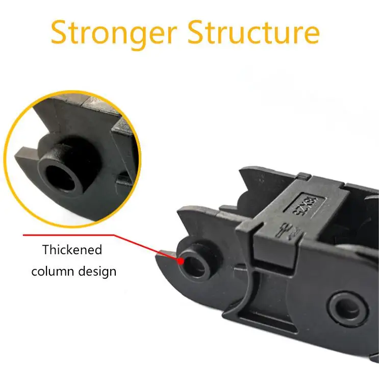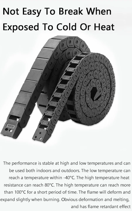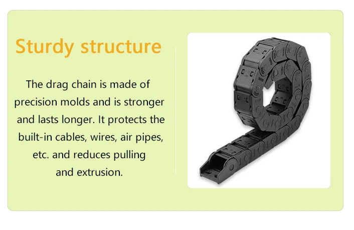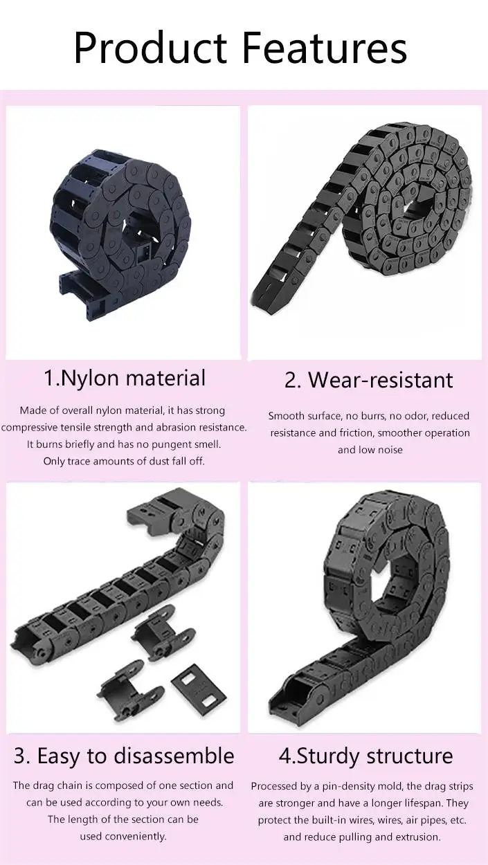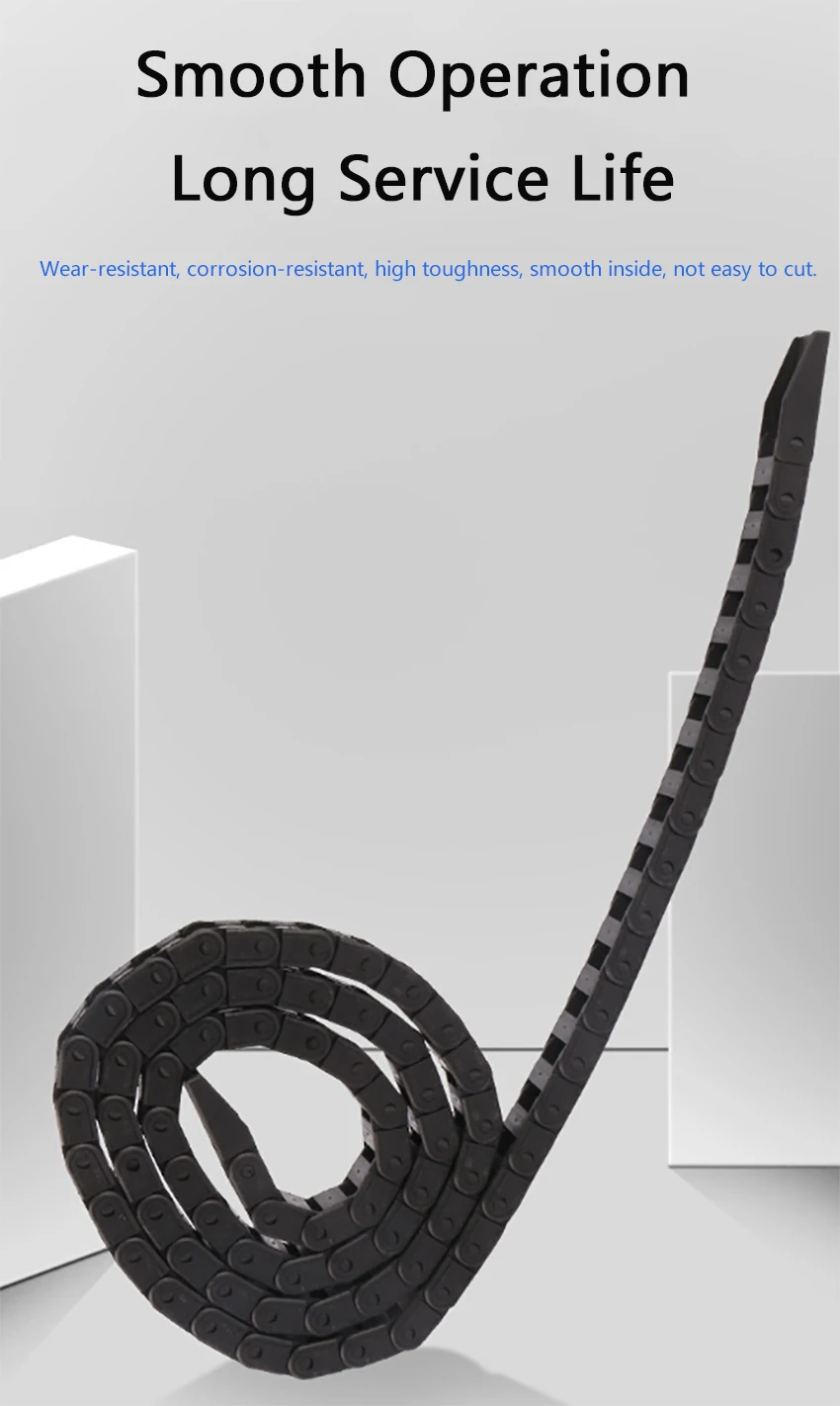 Usando novo material de náilon, a corrente de arrasto de náilon tem forte resistência e não é fácil de quebrar.De acordo com as características do material de náilon, a estrutura é firme, resistente a altas e baixas temperaturas, possui forte capacidade de carga, é mais resistente ao desgaste e tem uma longa vida útil.