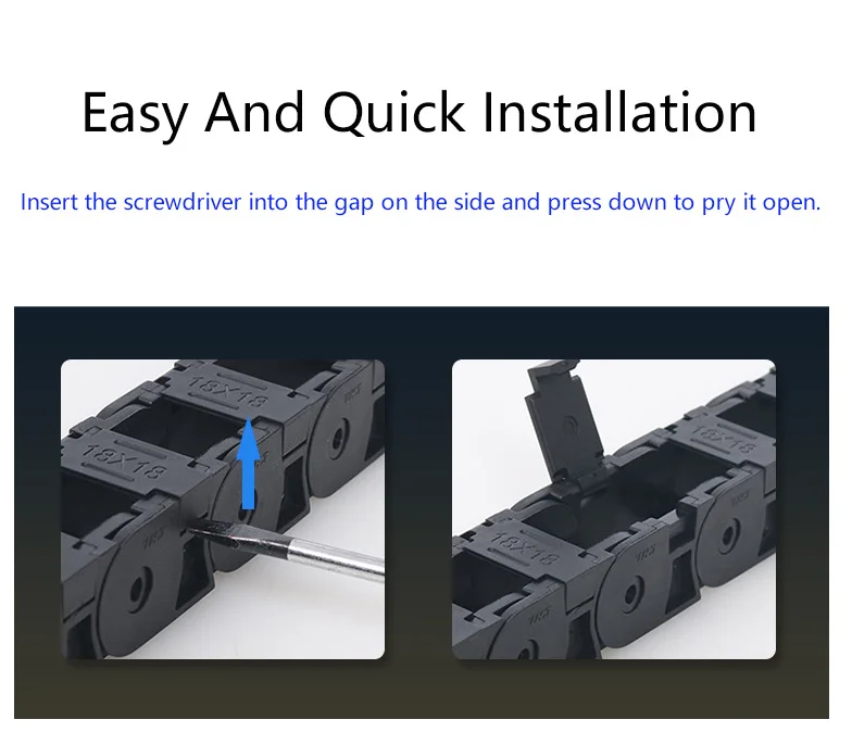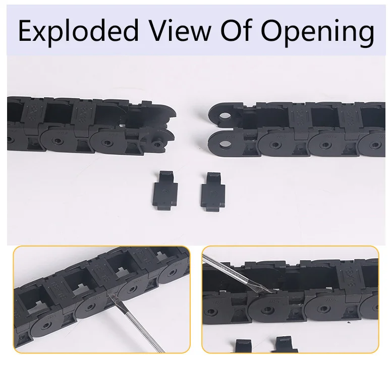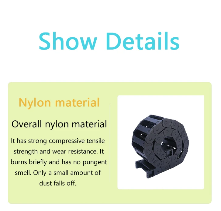 Os quatro principais detalhes do produto são que ele é feito de material de náilon, que é resistente ao desgaste, a arranhões e fácil de desmontar sem esforço.A corrente de arrasto tem uma estrutura sólida e forte capacidade de carga.