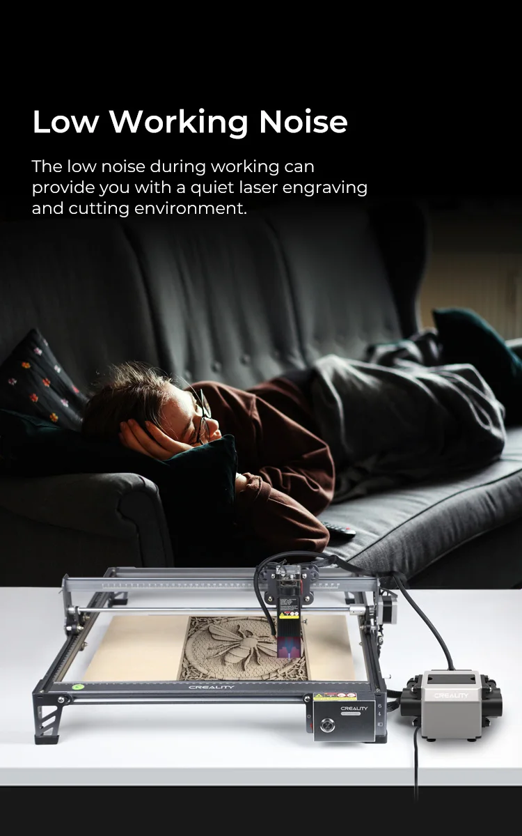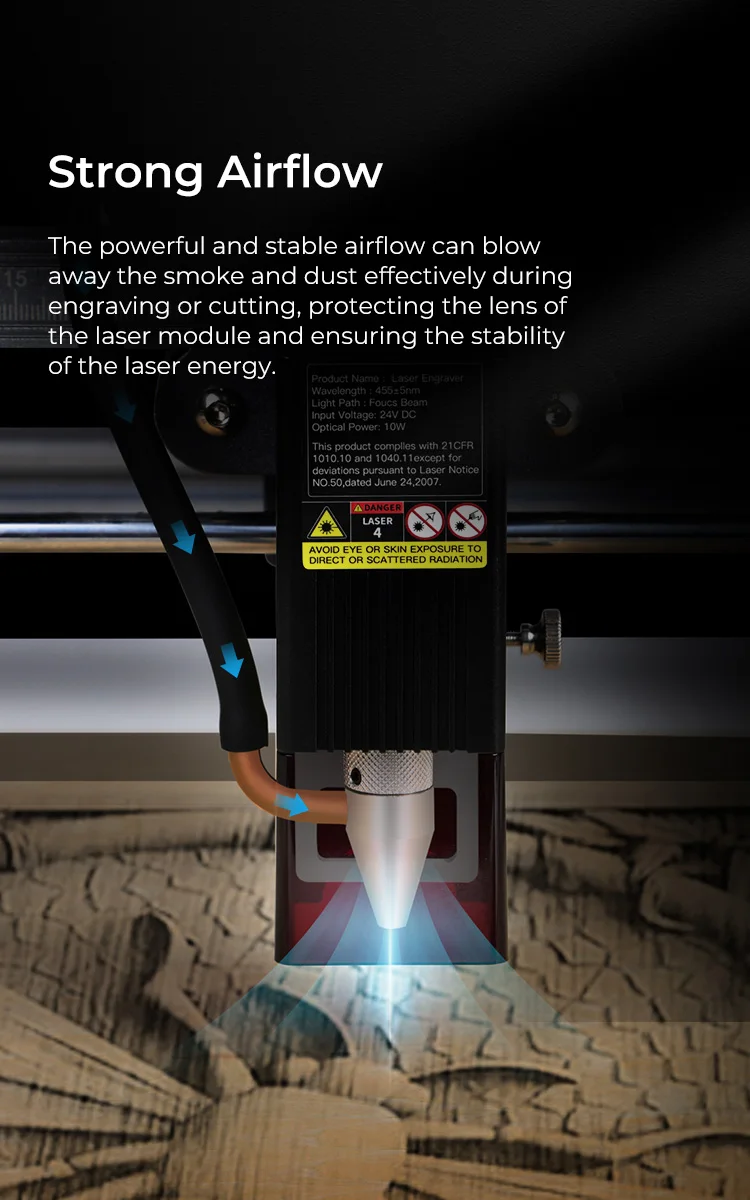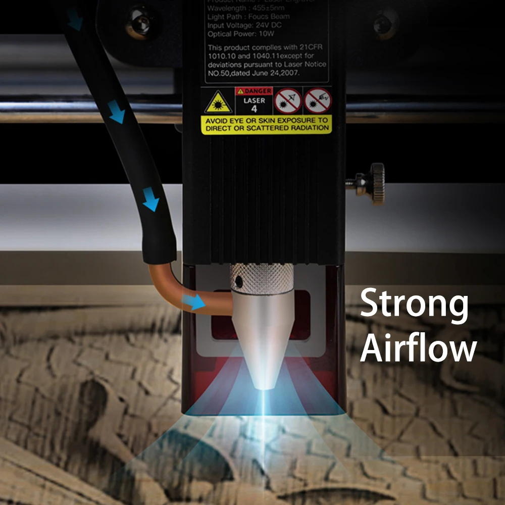O fluxo de ar poderoso e estável pode soprar a fumaça e a poeira efetivamente durante a gravação ou o corte, protegendo a lente do módulo laser e garantindo a estabilidade da energia do laser