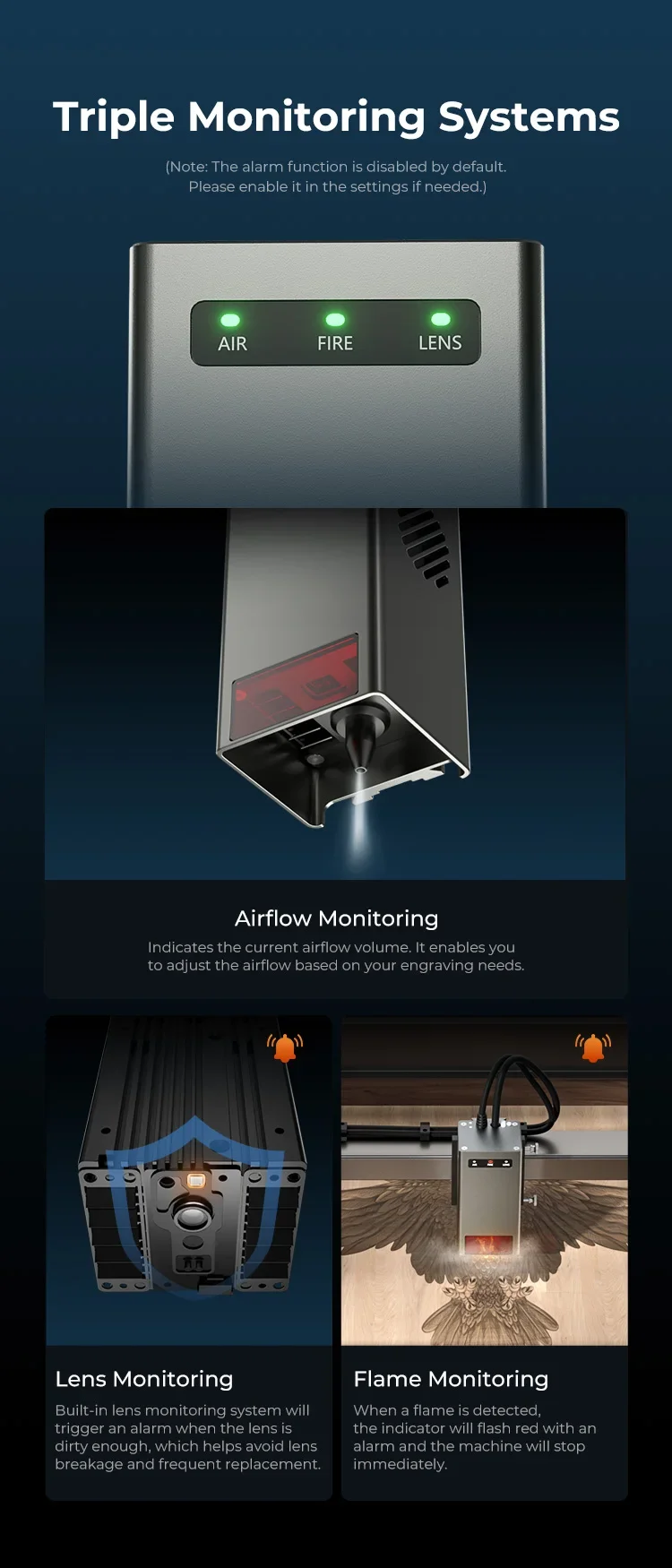 o fluxo de ar através do LightBurn, para remover a fumaça e proteger a lente do laser, trazendo um