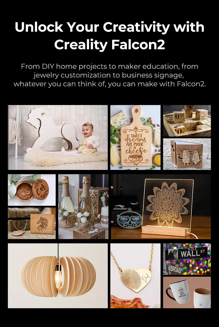 Desde projetos domésticos DlY até educação de fabricantes, desde personalização de joias até sinalização comercial, o que você possa imaginar, você pode fazer com Falcon2.