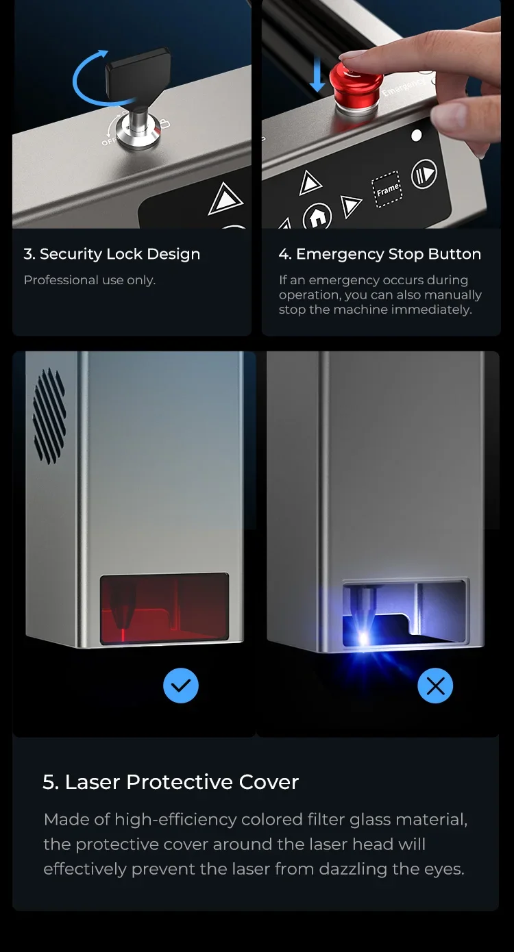 Feita de material de vidro de filtro colorido de alta eficiência, a capa protetora ao redor da cabeça do laser evitará efetivamente que o laser ofusque os olhos.