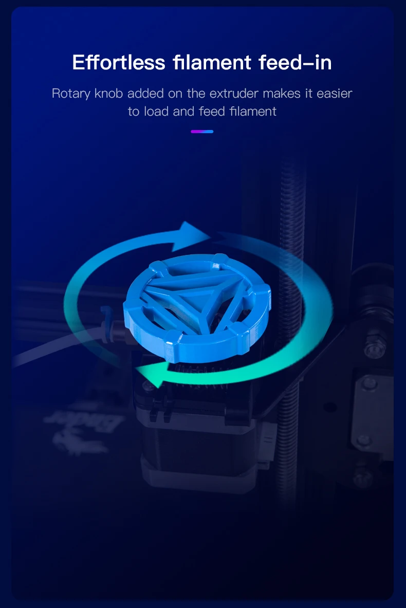 Ambos sabemos que quando colocamos o filamento na extrusora, é um pouco difícil de se alimentar. Então creality adiciona um botão giratório na extrusora para operar convenientemente. E o que é mais, precisamos pressionar a braçadeira da extrusão para alimentar-se, às vezes, a braçadeira da extrusão é fácil de ser quebrada, assim que o botão giratório é um design muito amigável.