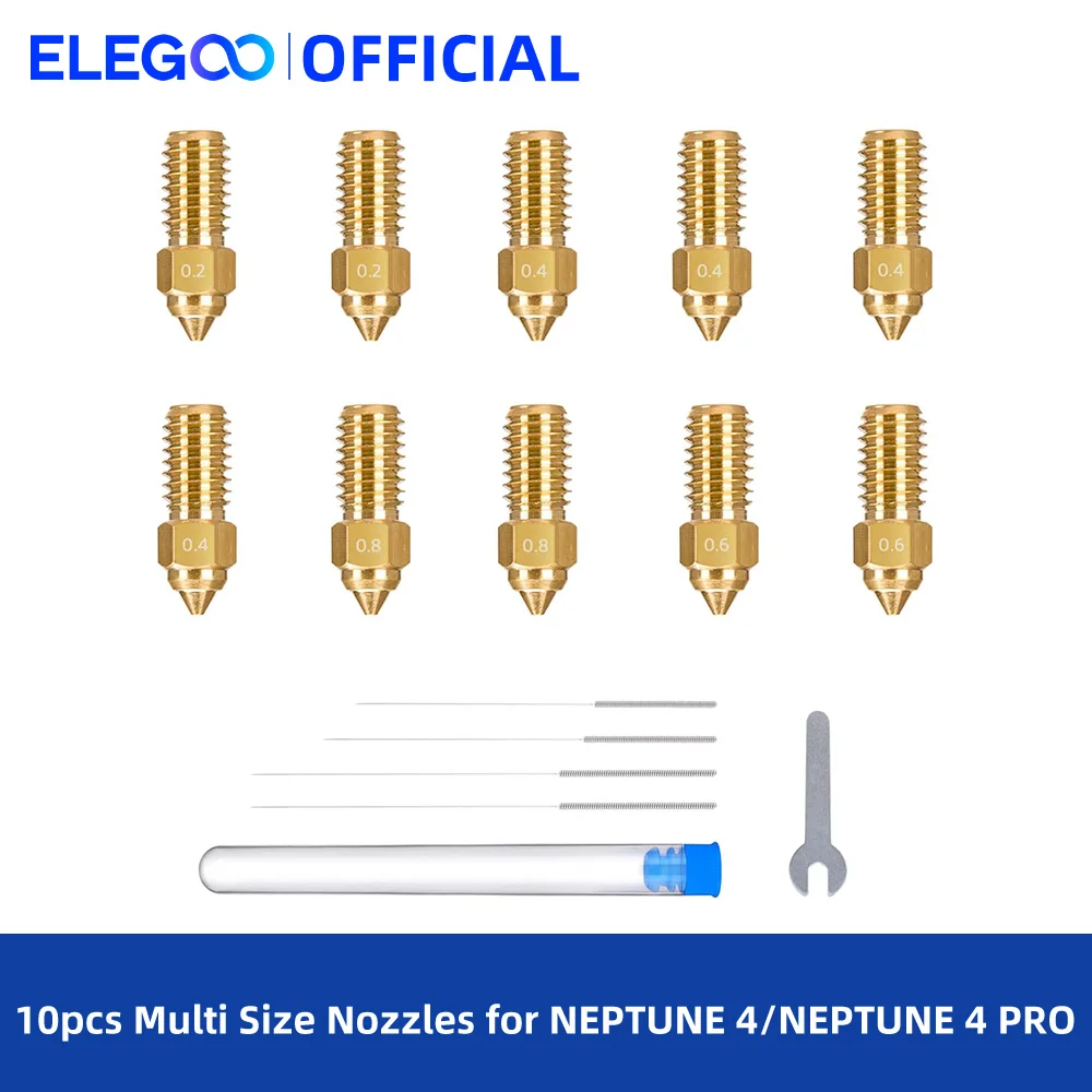 ELEGOO 10pcs Bicos de vários tamanhos para impressora 3D Neptune 4 e Neptune 4 Pro, bicos Hotend de latão 0,2 / 0,4 / 0,6 / 0,8 mm