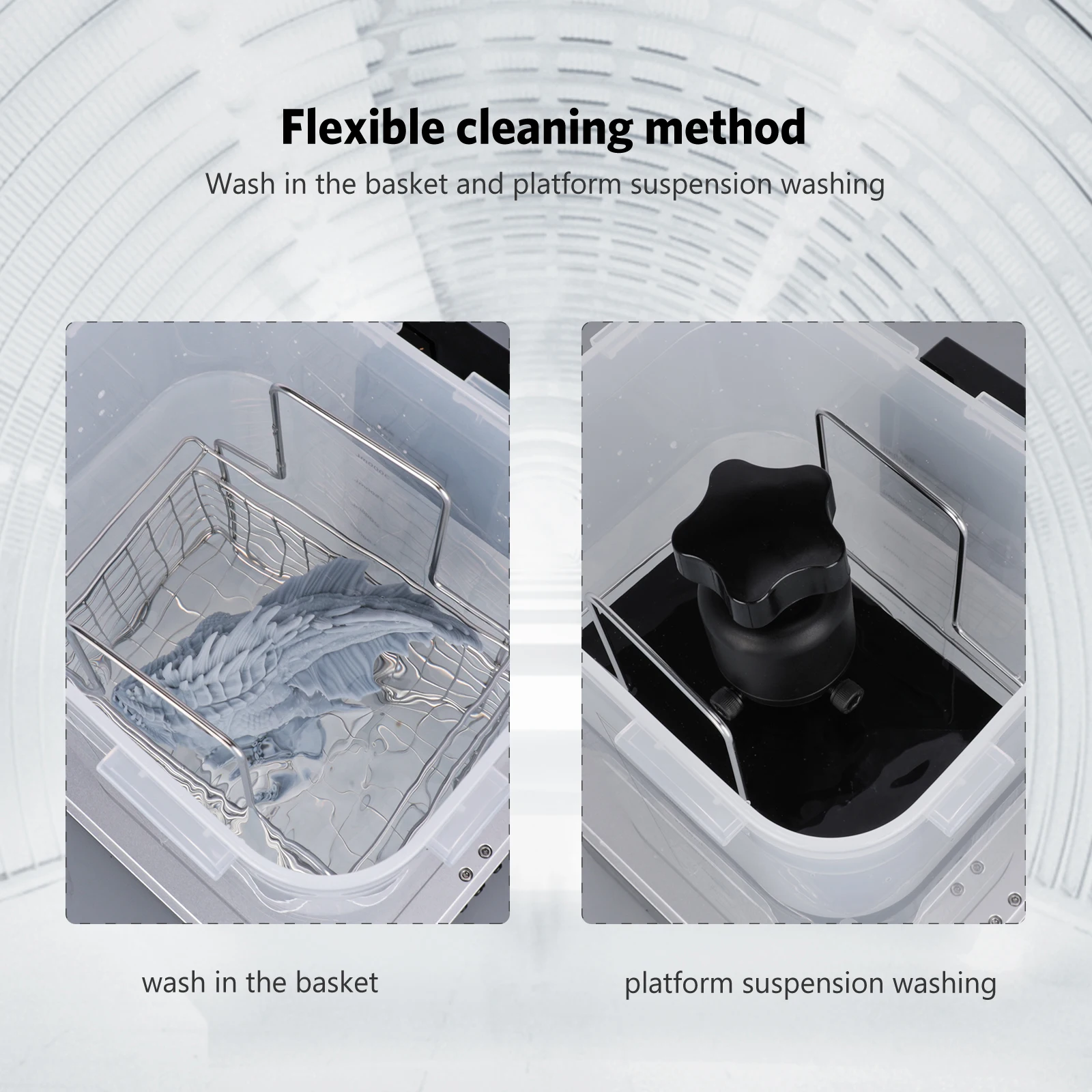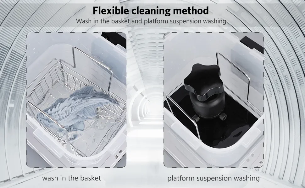 3. [Modo de lavagem flexível] Os modelos podem ser colocados em um cesto de limpeza para serem limpos separadamente ou montar a placa de construção com modelos e lavá-los juntos, qual pode evitar o contato direto com a resina uncured. A altura do suporte da plataforma pode ser ajustada para se ajustar ao nível do líquido no balde.