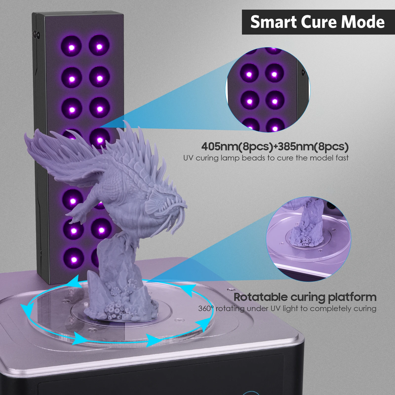 2. [Cura e lavagem inteligentes] A tela TFT frontal pode exibir diretamente o tempo de configuração e o tempo restante, e a operação é simples e intuitiva. Com built-in 16 pcs de 405nm UV LED e uma plataforma giratória de 360 graus, você pode uniformemente curar o modelo.