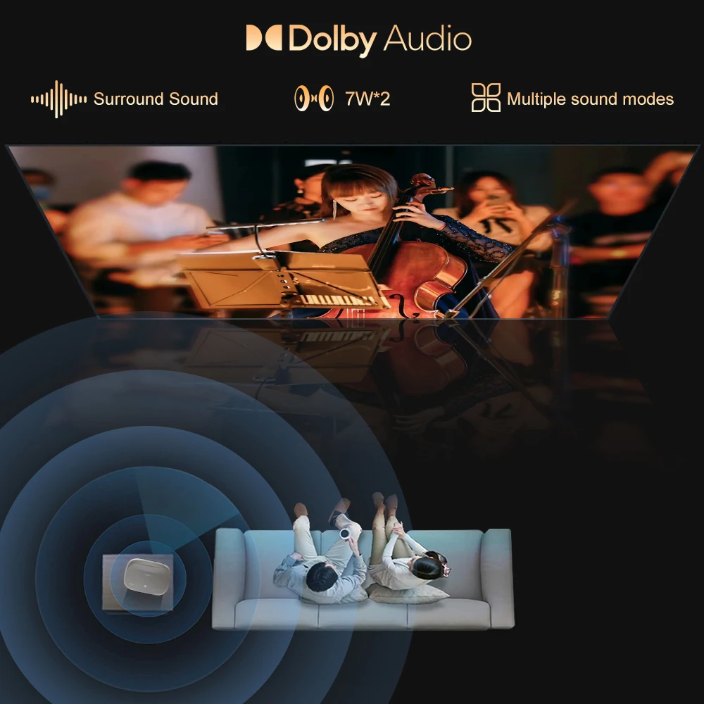 HQ10 Android Version: - System: Android 9.0 OS - Memory: RAM 2G + ROM 64G - WiFi: 2.4G /5G WiFi - Bluetooth-compatible, wireless connect with headphones, speaker, soundbar, keyboard, remote control - Support AC3 - Screen wireless push: Airplay/ Miracast / Wifi display wireless sync display with Android and IOS Phone - 6D Keystone : Support 4 point Keystone, and Auto & Electronic Vertical+Horizontal +/-50 Degree - Zoom : from 50-100% - The 4K formats: h265, h264 - Support HDMI-ARC (Need to be connected to HDMI port 2)