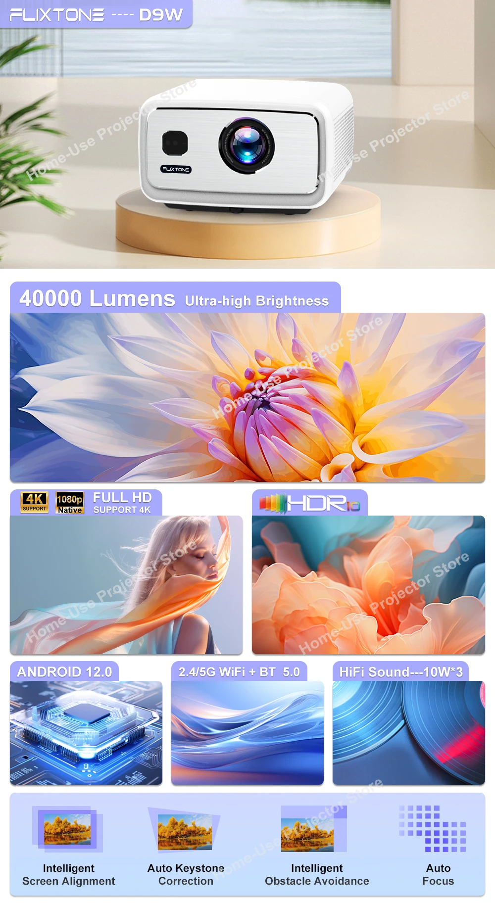 1. Alto brilho: 3000 ANSI lumens com três níveis de brilho ajustáveis-Alto (3000 ANSI), Padrão (2400 ANSI) e Baixo Ruído (2000 ANSI), adequado para vários ambientes. 2. Qualidade Full HD: Resolução nativa 1920 × 1080P, fornecendo imagens claras e detalhadas. 3. Som poderoso: 10W × 3 oradores estereofónicos com som surround 3D para uma experiência audio immersive. Lente 4.Smart: O foco automático, a correção keystone automática e a evitação de obstáculos garantem imagens claras e sem distorção. 5. Motor leve selado: Efetivamente impede a entrada de poeira, prolongando a vida útil do projetor. 6. Contraste alto: relação de contraste 26000:1 com suporte HDR 10 +, oferecendo cores ricas e pretos profundos para uma experiência visual aprimorada. 7. Sistema liso: Posto por Android 12.0, apoia uma vasta gama de formatos, fazendo o playback video sem esforço. 8. Grande projeção da tela: Apoia até uma tela de 300 polegadas, fornecendo uma experiência impressionante e immersive da visão. 9. Espelhamento de tela sem fio: Suporta AirPin, Miracast e Wi-Fi, compatível com dispositivos Android e iOS. 10.6D Auto Keystone Correção: Suporta correção keystone automática de 4 pontos, com ajustes verticais e horizontais, garantindo uma imagem perfeita.