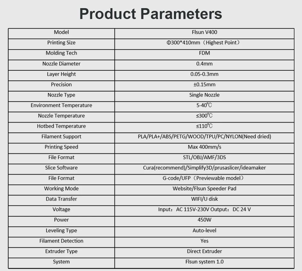 FLSUN V400 is equipped with klipper firmware and ultra-light short-range extruder design, double-drive wire feeding structure+5-1 reducer+36 high-temperature high-precision stepping motor, and the extrusion force can reach 70N, meeting the requirements of 400mm/s High-Speed Printing & 8000+ mm/s² acceleration.