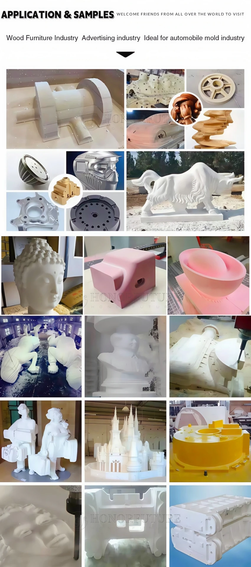 1.Indústria de móveis/carpintaria:Cadeira, porta, janela, cama, armário, tela, faixa artesanal, portões compostos, portas de armário, portas internas, pernas de sofá, murais artísticos, cabeceiras, móveis clássicos e antigos de jacarandá, móveis europeus requintados, escultura de móveis tipo tela plana, produtos decorativos escultura, placa ondulada, superfície de mesa de armário de mármore artificial ou outras decorações escultura. 2.Indústria de Publicidade:identificação publicitária, outdoors, sinalização, emblemas, logotipo, placa da empresa, placas, emblemas, painéis de exibição, sinais de feiras, números de edifícios, sinais de decoração, corte de furos literários, etc.; Corte de caracteres 3D, corte de acrílico, canal LED/neon, caixa de luz. 3.Indústria de obras de arte:Enfeites de madeira maciça, lembranças, presentes, gravação de superfície 3D de instrumento, moldura de foto, artesanato em madeira, caixa de presente, caixa de joias e outros artesanatos requintados. 4.Indústria Eletrônica:placa de circuito, medidor de isolamento, tela de LED e gravação e corte de PCB.