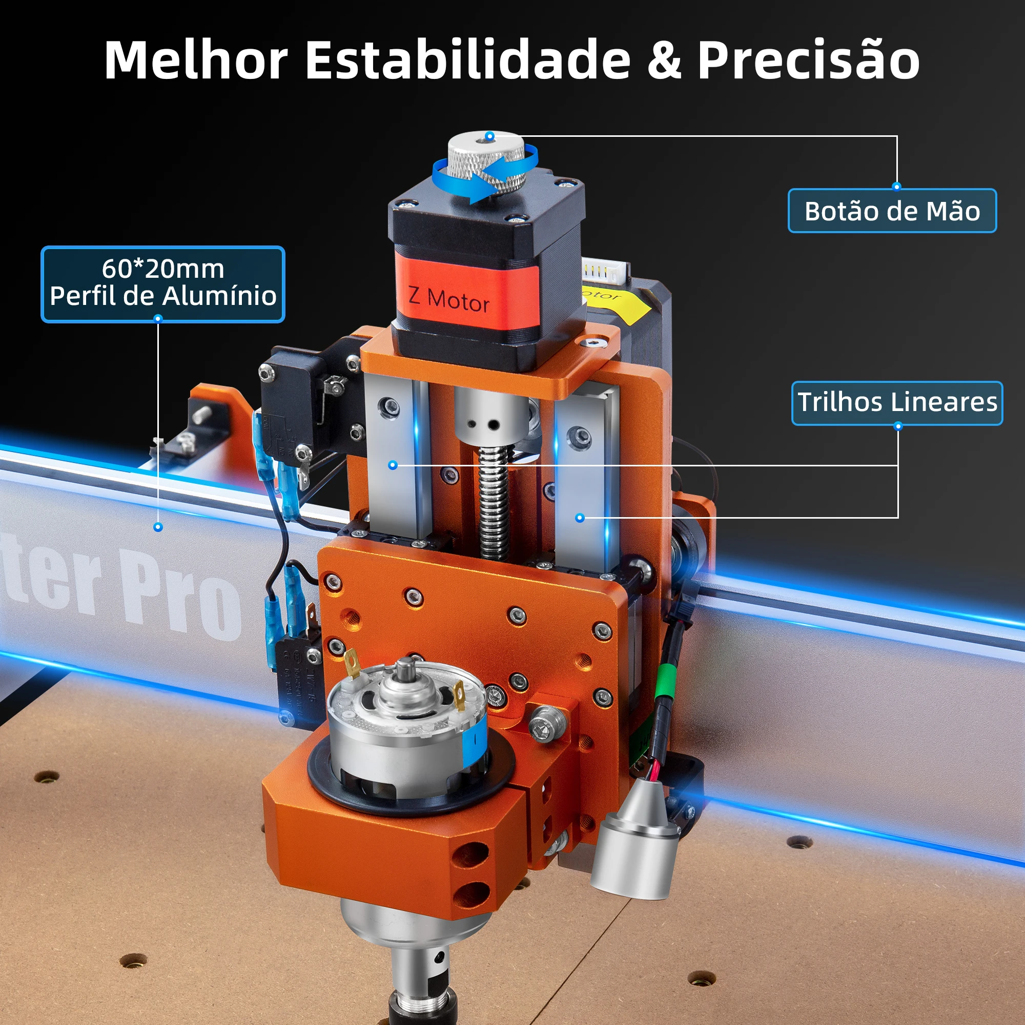 【Luz trabalho adicional】 Uma pequena luz de trabalho é adicionada ao eixo Z. Ele ajuda você a monitorar os detalhes de escultura e processar mais claramente. Cada motor deslizante tem um botão para facilitar o ajuste manual.