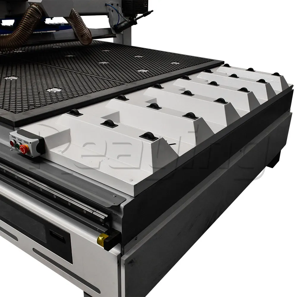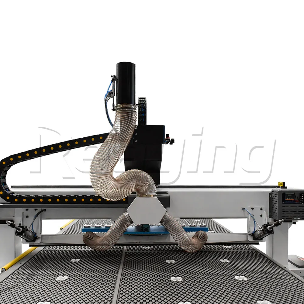 É equipado com um aspirador de cano duplo de alta potência 5.5KW, que tem bom efeito de coleta de poeira. A coleta de poeira secundária do material empurrador está limpa e no lugar. Após o processamento, o material é carregado diretamente e não há necessidade de limpar a mesa manualmente.