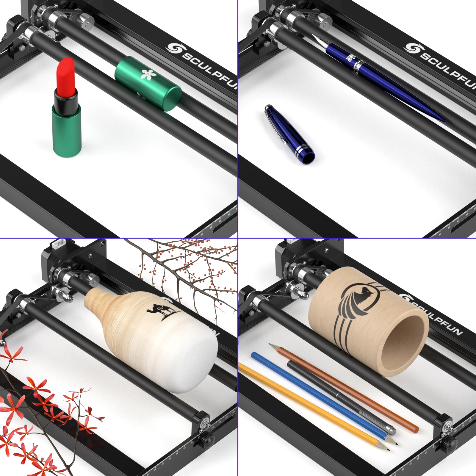 4. Gravura de alta precisão em escala original de 100%: os rolos SCULPFUN usam eixos de borracha 70A de alta fricção para evitar derrapagens e a velocidade linear da superfície rotativa foi calculada, conecte diretamente o cabo da máquina de gravação para gravar a imagem original em escala 100%. A imagem não será ampliada ou reduzida.