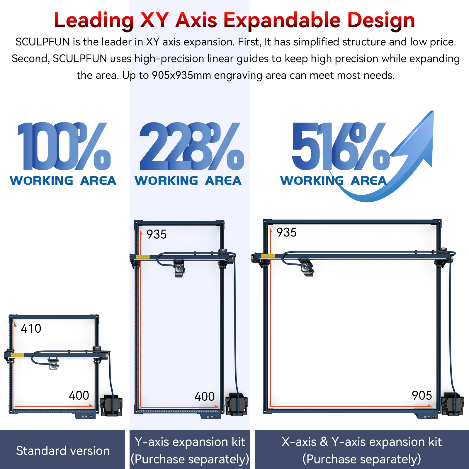 Tamanho da área de gravação: a versão padrão é 410*400mm, que pode ser expandida para 935x400mm ou 935x 905mm