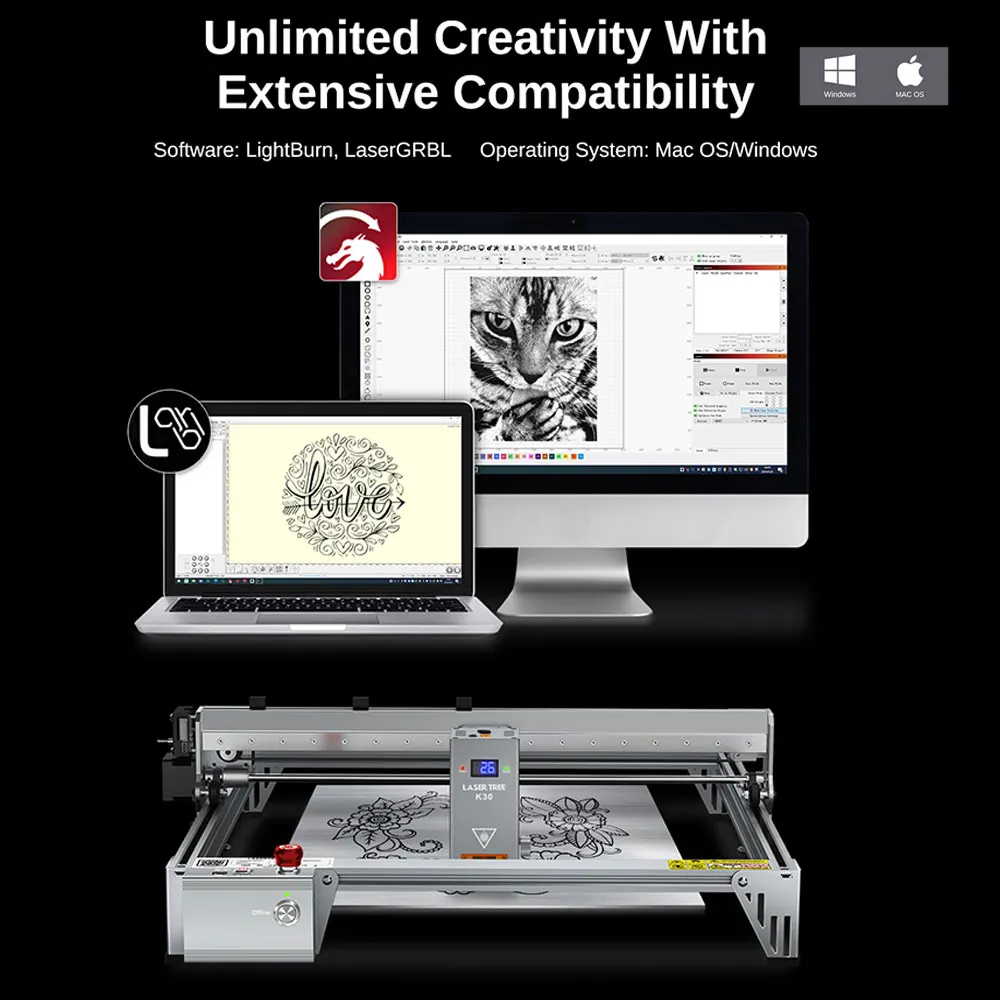 Software: LightBurn, LaserGRBL Sistema operacional: Mac OS/Windows