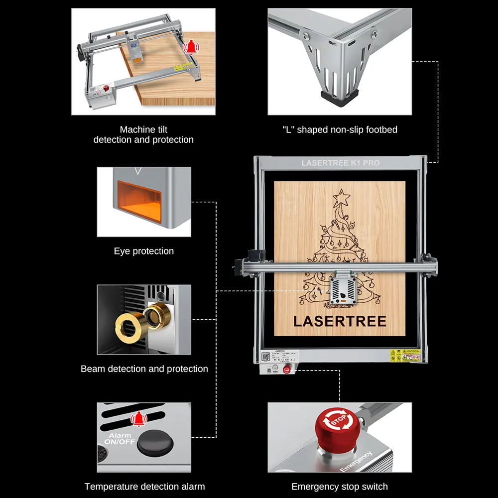 1Detecção e proteção de inclinação da máquina:Quando a máquina de gravação se inclina durante a operação, a energia será cortada automaticamente. Palmilha antiderrapante em forma de 2"L": fornece almofada de proteção para manter o gravador estável durante o trabalho. 3Interruptor de parada de emergência:Em caso de emergência, você pode pressionar o botão de parada de emergência para parar o gravador. 4 Alarme de detecção de temperatura:Quando ocorre um alarme de superaquecimento, pressione uma vez para desligar o som do alarme sonoro.Quando a temperatura de trabalho do módulo laser for superior a 55 °C, a campainha soará um alarme.Para obter boa estabilidade de energia e durabilidade, sugere-se manter a temperatura de trabalho do módulo abaixo de 55°c e temperatura ambiente abaixo de 35°C. 5Detecção e proteção de feixe 6Proteção para os olhos: Janela de visão a laser --- Janela de visão anti-luz azul com material de vidro óptico, protege seus olhos da luz azul, sem medo de molduras.