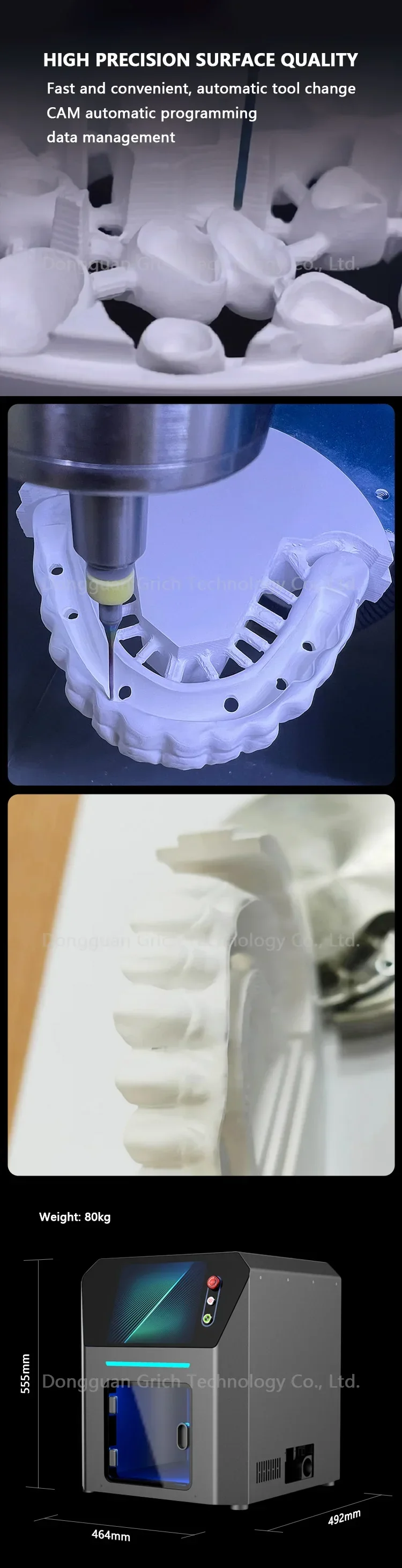 A fresadora dentária de metal de titânio usa ferro fundido Meehanite para seu material de estrutura principal, também com sua moldagem de corpo de peça única, nenhuma soldagem é necessária, o que torna a fresadora muito mais pesada, mas mais estável na fresagem das restaurações de titânio.