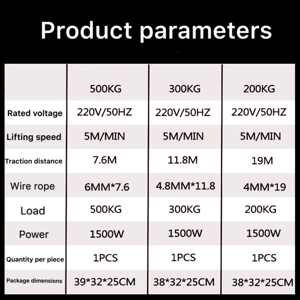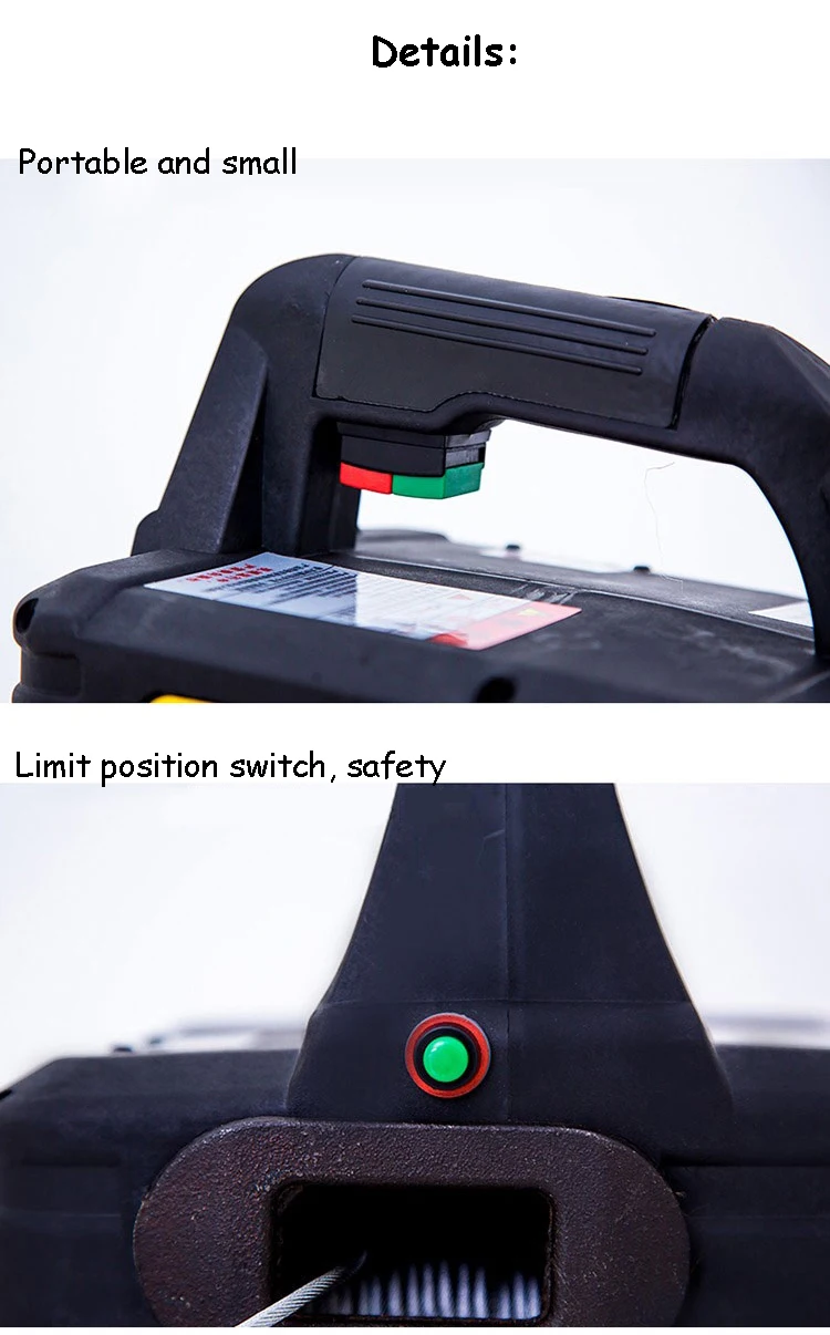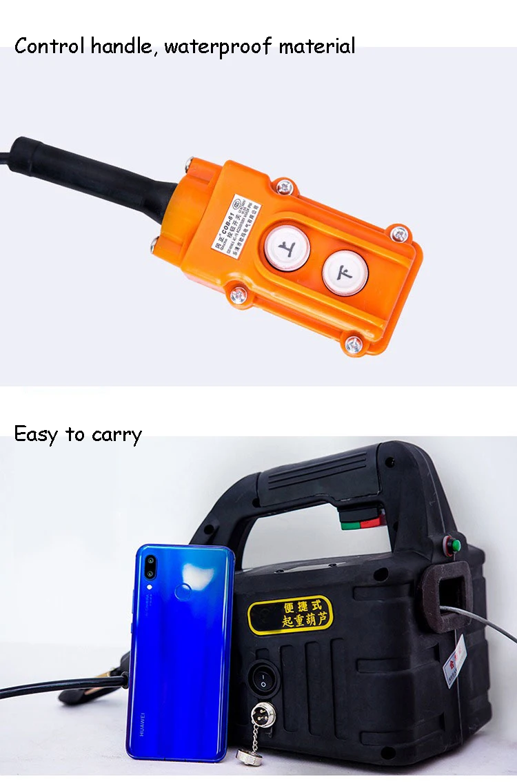 Talha Elétrica Pequena Portátil com Controle Remoto 7,6m Elevação Cap. 500kg, Talha de cabo de aço, Carcaça de alumínio, 3 em 1