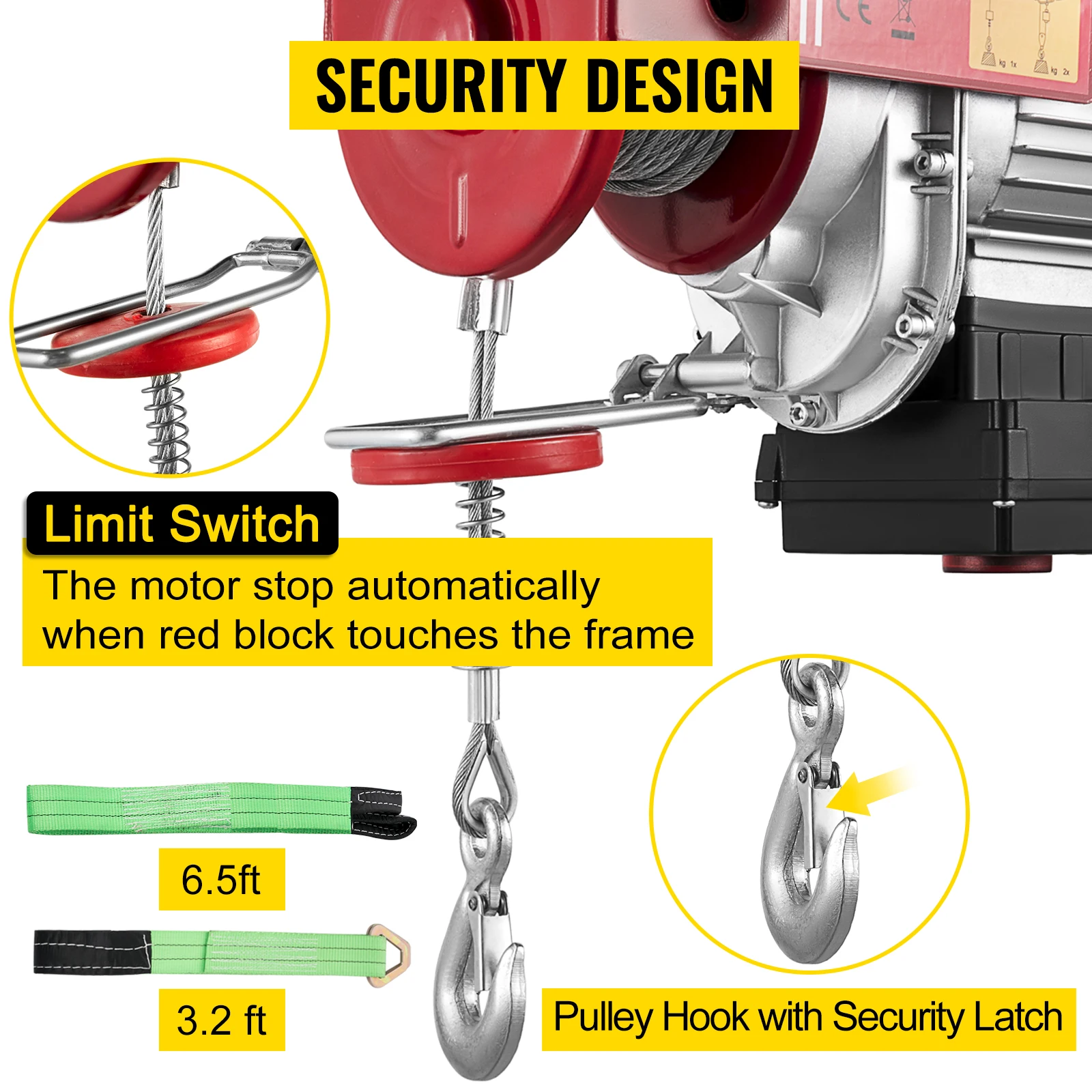 Quando o bloco vermelho toca o interruptor de limite, o motor pára automaticamente para proibir a sobrecarga das correntes. Além disso, o fio de aço zincado anti-rotação é menos susceptível de torcer, mais seguro do que a média.