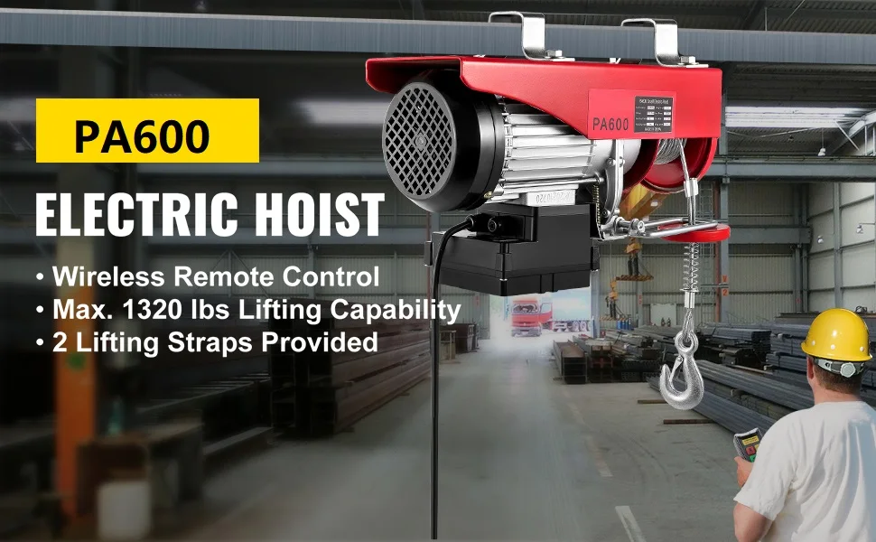 Esta talha elétrica, com uma capacidade de carga de 1320 lbs/600 kg, é muito adequada para levantar motores, mesas, madeira e equipamentos de loja-sem necessidade de subir escadas. Você pode carregar e soltar a uma distância segura através do controle remoto. Este é um guincho elétrico ideal para cenários abrangentes no carregamento de equipamentos pesados.
