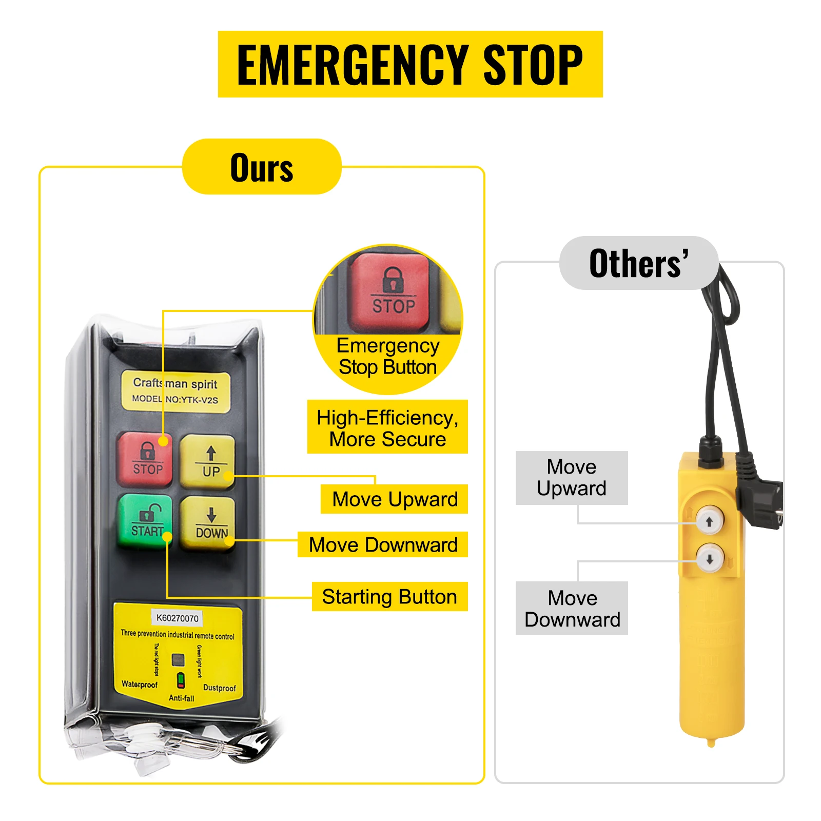 O botão Emergency stop foi adicionado ao nosso guincho em contraste com os outros. Isso significa que você pode parar a máquina a qualquer momento para evitar o acidente e operá-la com segurança. A cabeça pressionando está subindo, inversamente indo para baixo.