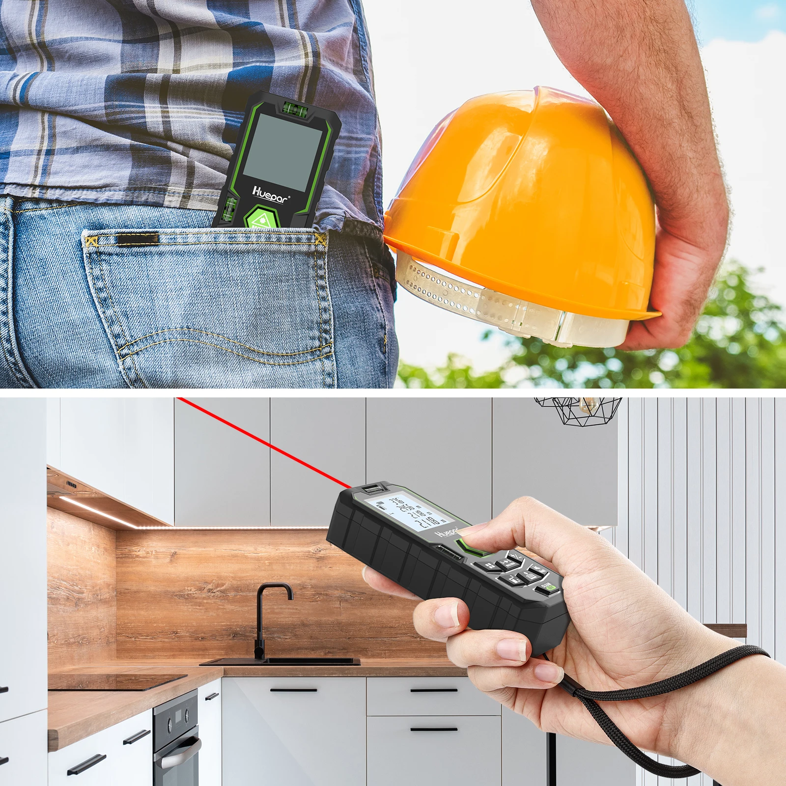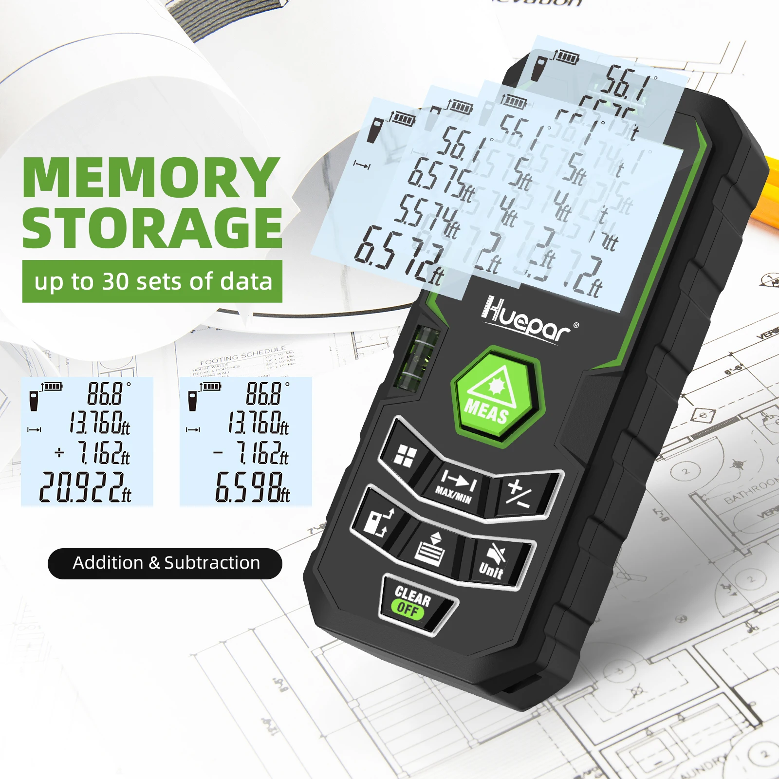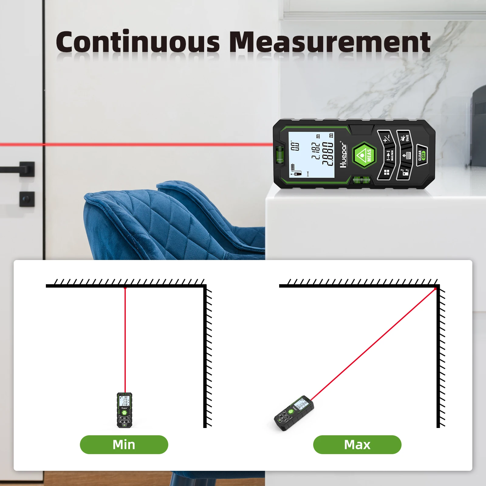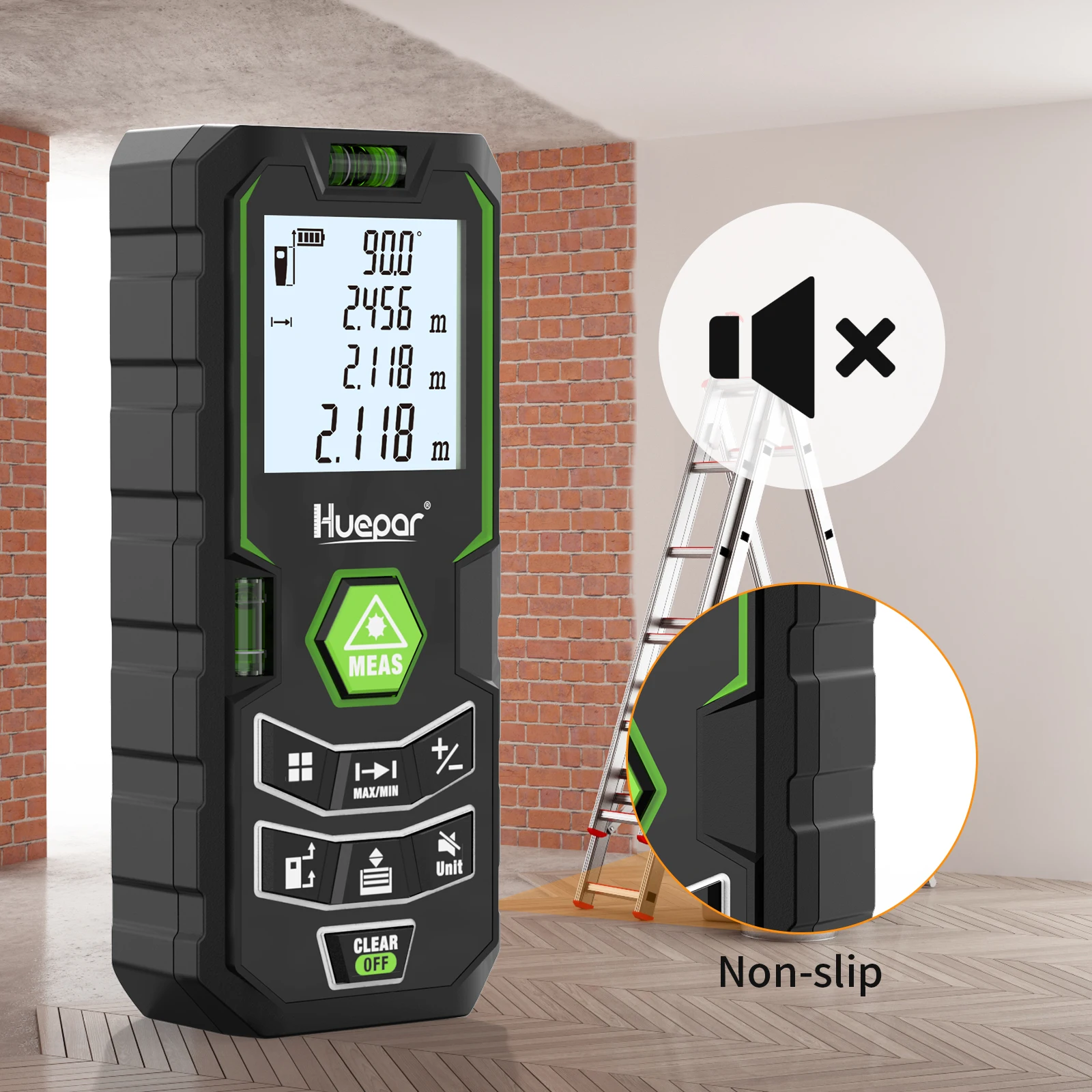 O medidor de distância a laser digital Huepar suporta vários modos de medição, incluindo medição de distância, área, volume e Pitágoras.