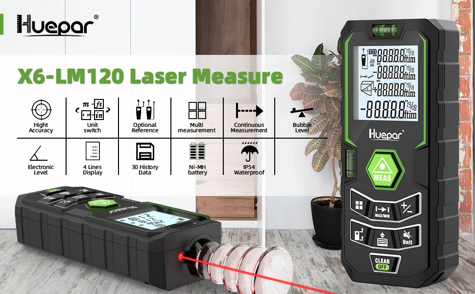 Medidor de distância a laser Huepar X6-50/100/120M/In/Ft Medidor a laser LCD retroiluminado com sensor de volume de área de ângulo elétrico multimodos