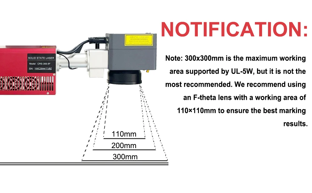 Nota:300x300mm é a área de trabalho máxima suportada por UL-5W, mas não é a mais recomendada. Recomendamos usar uma lente F-theta com uma área de trabalho de 110 × 110mm para garantir os melhores resultados de marcação.