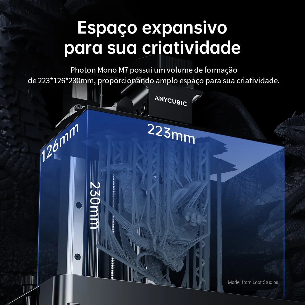 Photon Mono M7 tem um tamanho de formação de 223*126*230mm, proporcionando amplo espaço para sua criatividade.