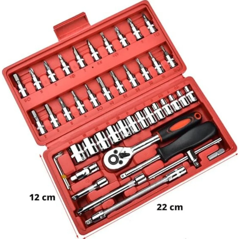 O kit de ferramentas com 46 peças é uma maleta com ferramentas uteis para manutenções que podem ser feitas em ambiente doméstico, para veículos, motocicletas e outros.