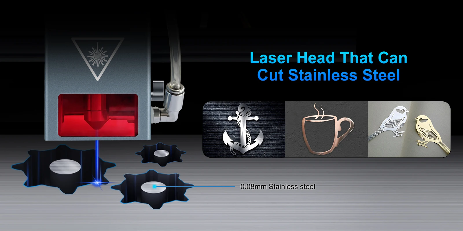 🏆Design detalhado da cabeça do laser K30: a.A estrutura de trabalho pode ser posicionada por uma mira vermelha, o que também é útil para melhorar a comodidade do corte secundário; b.O design da barra de foco facilita a configuração do foco do módulo; c. A parte superior do módulo laser adiciona um suporte de tubo de ar e um suporte de cabo Peça de aço inoxidável 2 em 1.