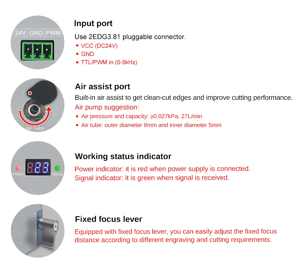 Seu poder pode proporcionar uma experiência de corte completamente diferente.Para melhorar a compatibilidade com diferentes máquinas de gravação a laser, o K30 fornece uma solução por placa adaptadora para compatibilidade elétrica e placa deslizante com vários furos para compatibilidade de instalação.A compatibilidade elétrica pode ser verificada facilmente pelo indicador LED de 'alimentação' e'sinal'.O foco é mais conveniente e o resfriamento com ventilador duplo é excelente.Esses recursos proporcionam ao K30 desempenho confiável e estável e maior vida útil.