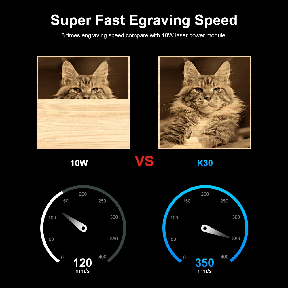 A cabeça do laser LaserTree K30 tem uma potência de saída de 28W ~ 32W.Ele usa tecnologia comprimida de feixe para combinar 6pcs 5W diodos laser em um poderoso feixe de laser com potência de laser de 30W.