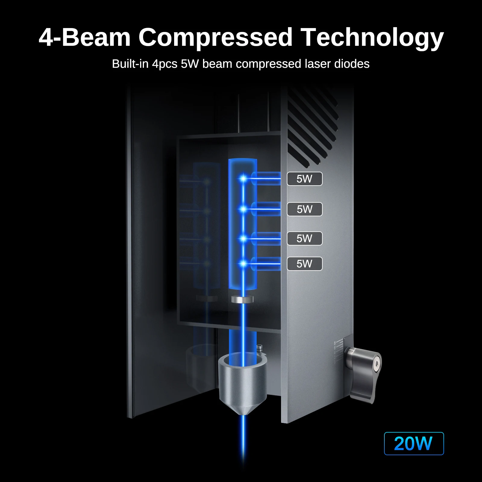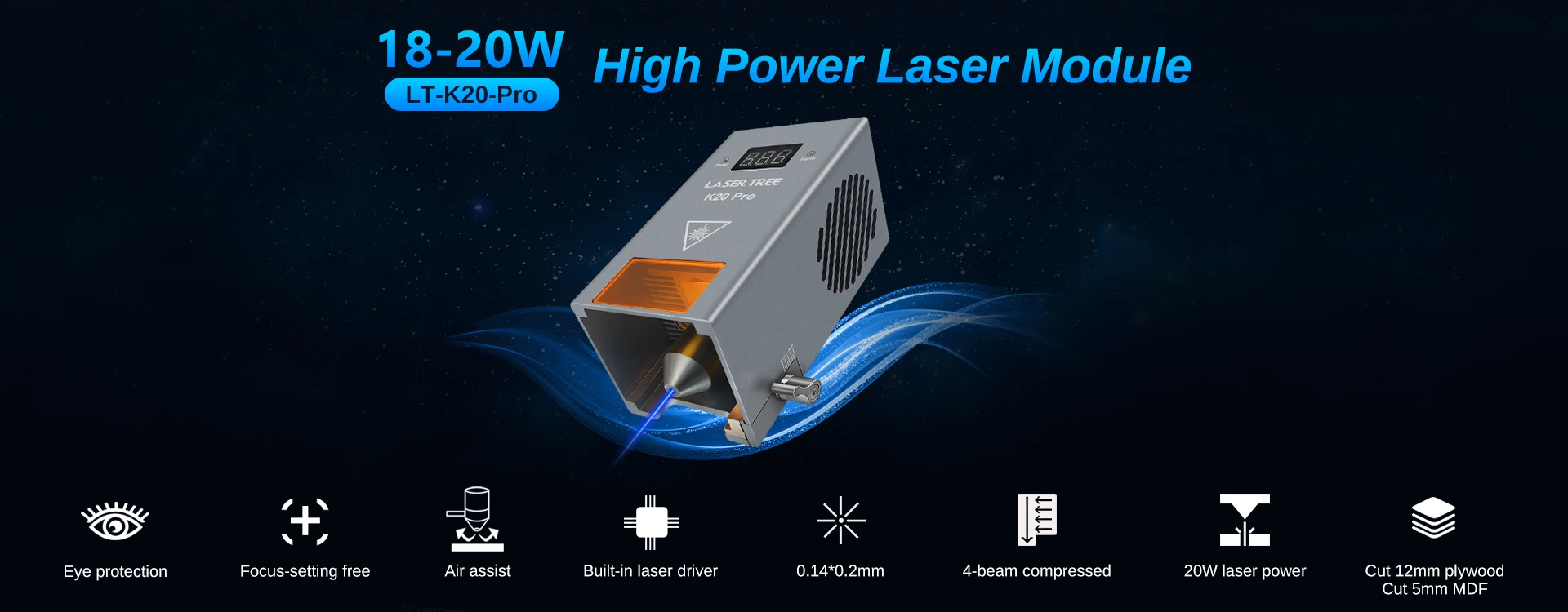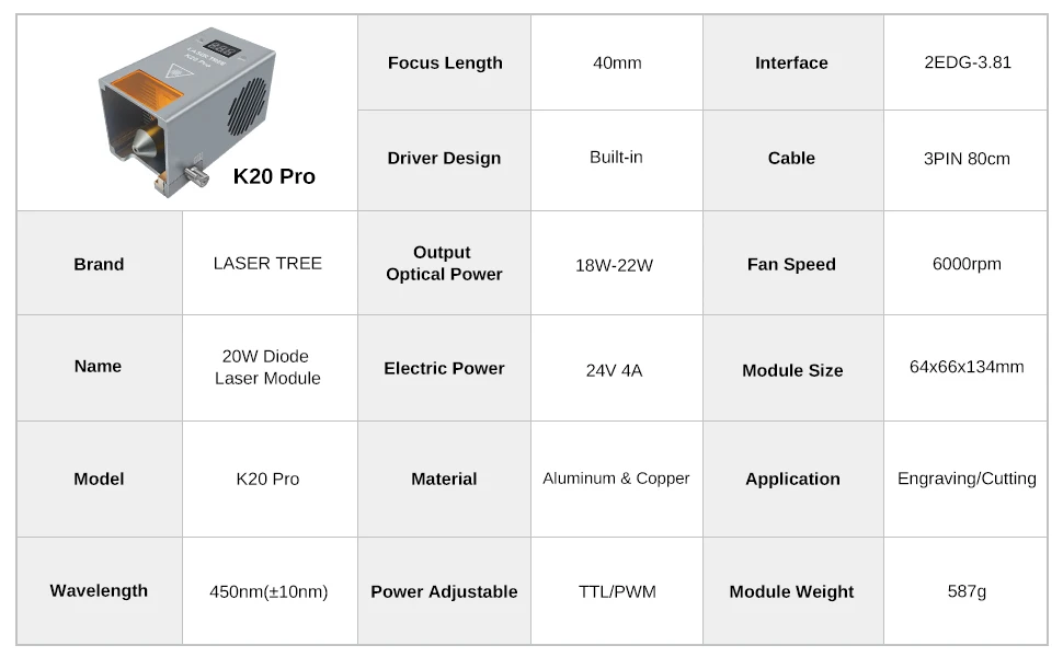 LaserTree K20 é um verdadeiro módulo de gravação e corte a laser com potência óptica de saída de 18-22 W.Ele usa tecnologia comprimida de feixe para combinar diodos laser 4pcs 5W em um poderoso feixe de laser com potência de laser de 20W.
