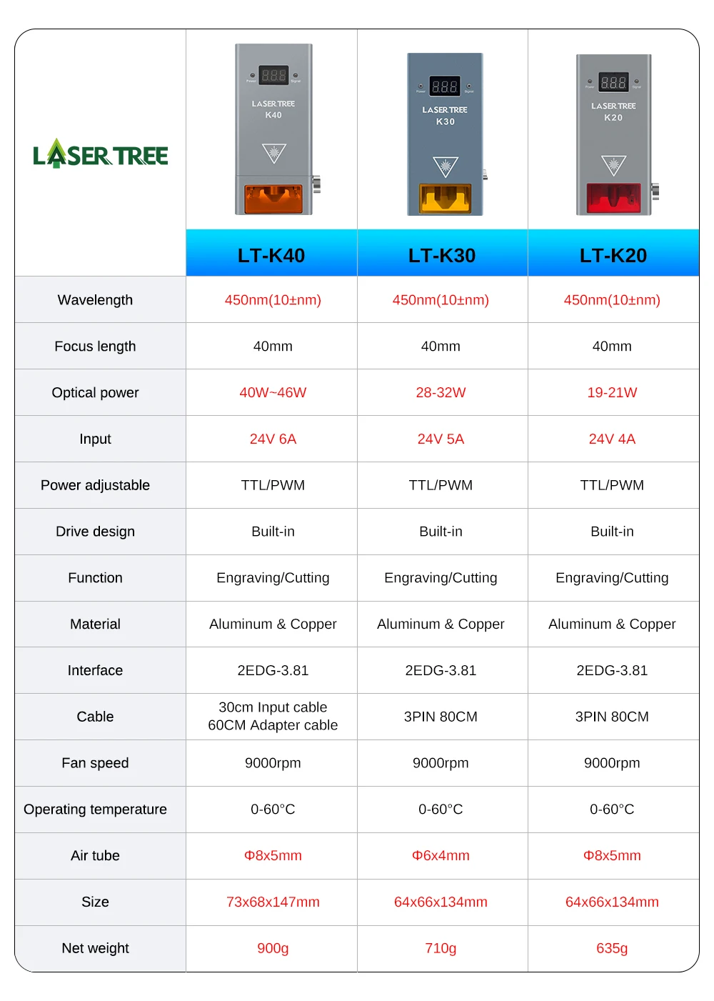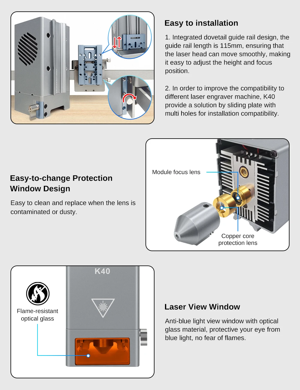O foco é mais conveniente e o resfriamento com ventilador duplo é excelente.Esses recursos proporcionam ao K40 desempenho confiável e estável e maior vida útil.