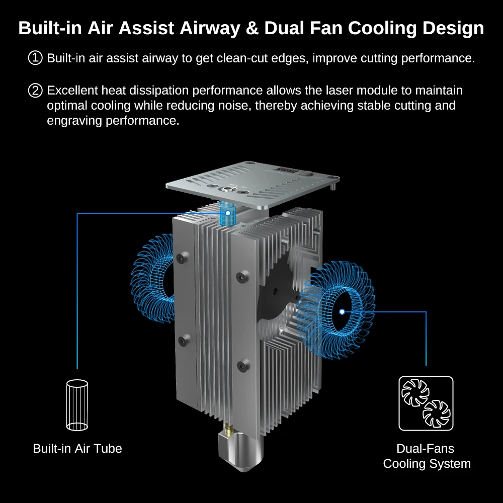 🏆Adote um grande design de ventilador duplo para maximizar o volume de ar e manter o melhor efeito de resfriamento enquanto reduz o ruído, alcançando assim desempenho estável de corte e gravação.