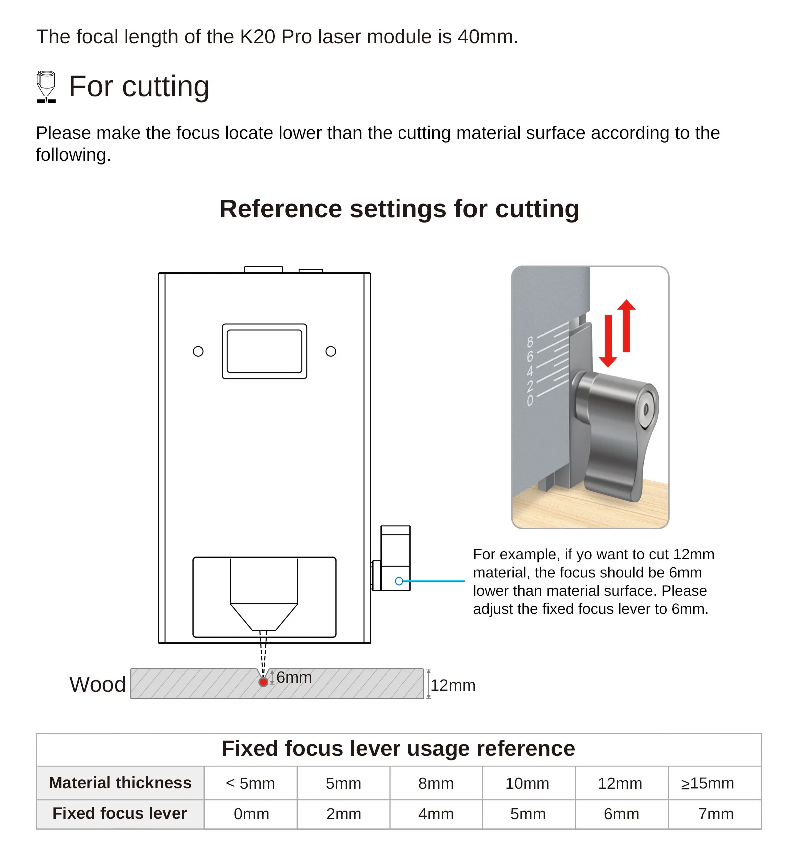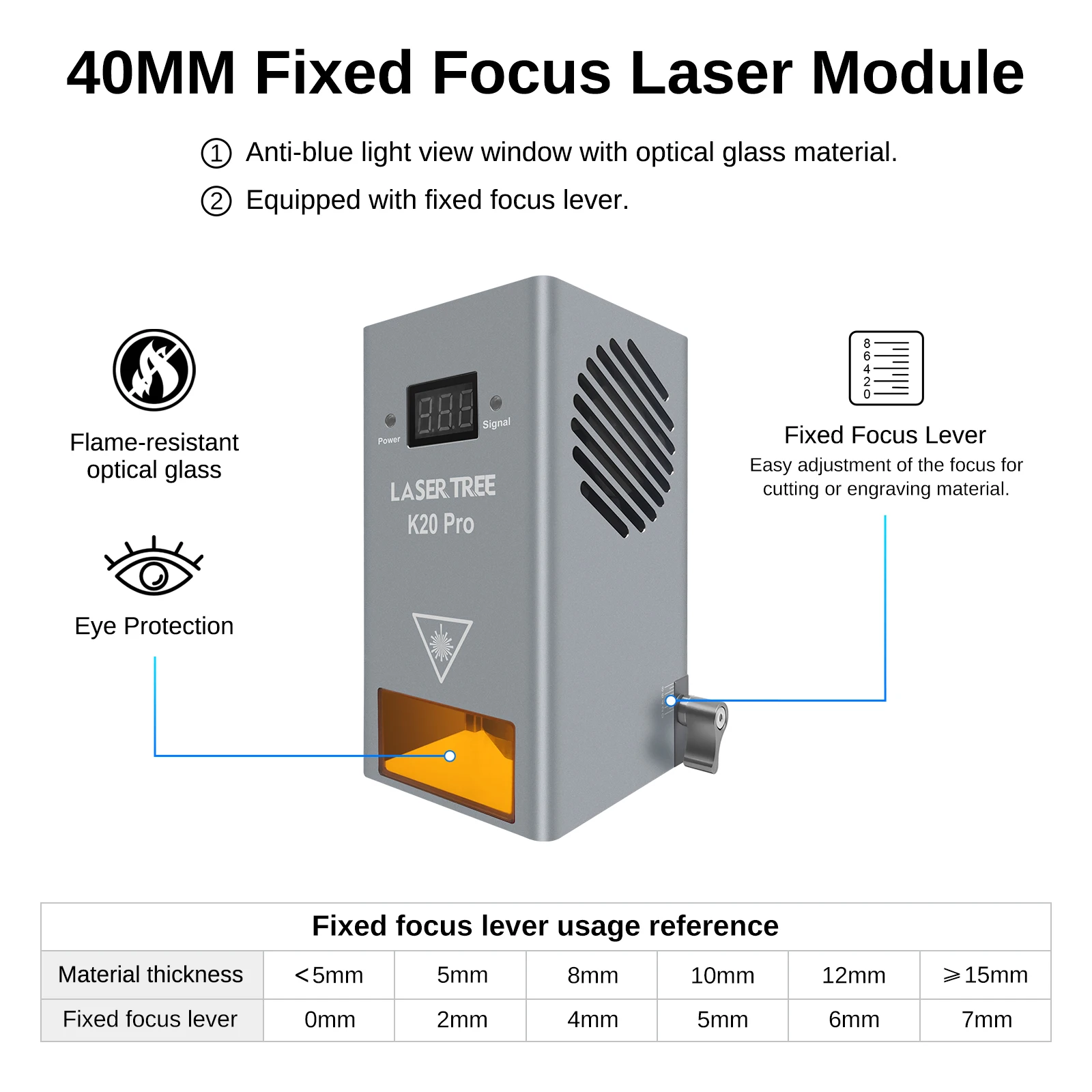 🏆Módulo de laser de diodo de ultra-alta potência - LASER TREE K30 é um módulo de corte a laser de saída óptica real de 30 W + projetado para corte potente (28-32 W).Esta cabeça de laser usa tecnologia de compressão de feixe e 6 diodos de laser de 5,5 W integrados.O módulo de corte a laser LASER TREE pode cortar madeira de pinho de 20 mm, acrílico de 30 mm e compensado de 15 mm por uma só vez.Se você precisar cortar muitos materiais grossos e acelerar a produção, o poderoso módulo laser de 30 W é uma boa escolha para atualização a laser.Foco fixo: 40mm