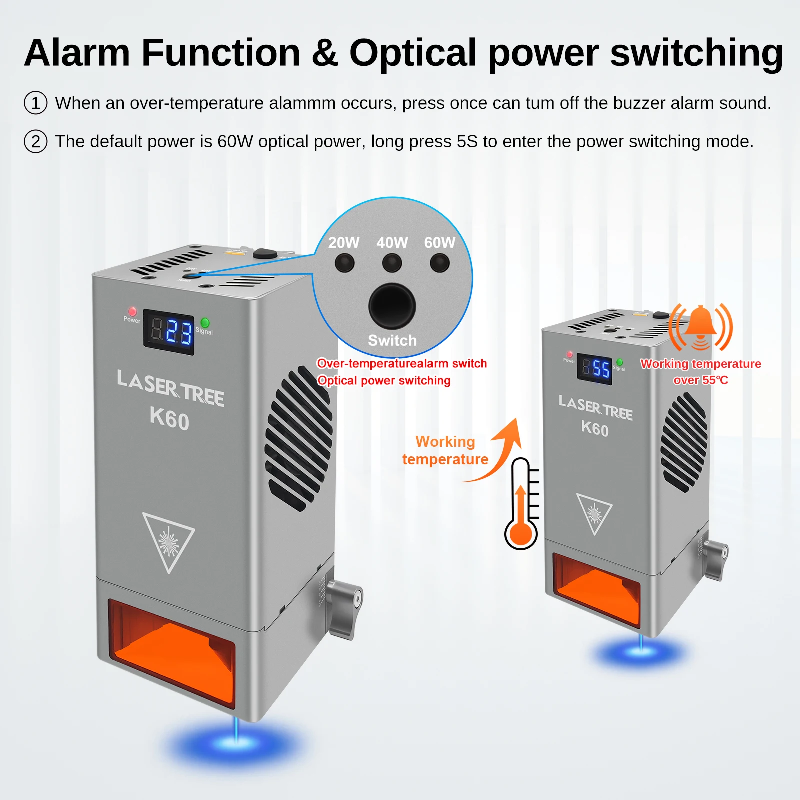 🏆Função de aviso de alta temperatura: Devido a temperaturas de trabalho excessivas, pode reduzir o tempo de vida útil da cabeça do laser a uma taxa acelerada, de modo que o LASER TREE crie uma solução com display de temperatura de trabalho para o módulo laser K30, para que você possa verificar a temperatura interna do módulo facilmente.A campainha soará um alarme quando a temperatura da cabeça do laser for superior a 55℃ (Temperatura ambiente de trabalho sugerida <35℃.)